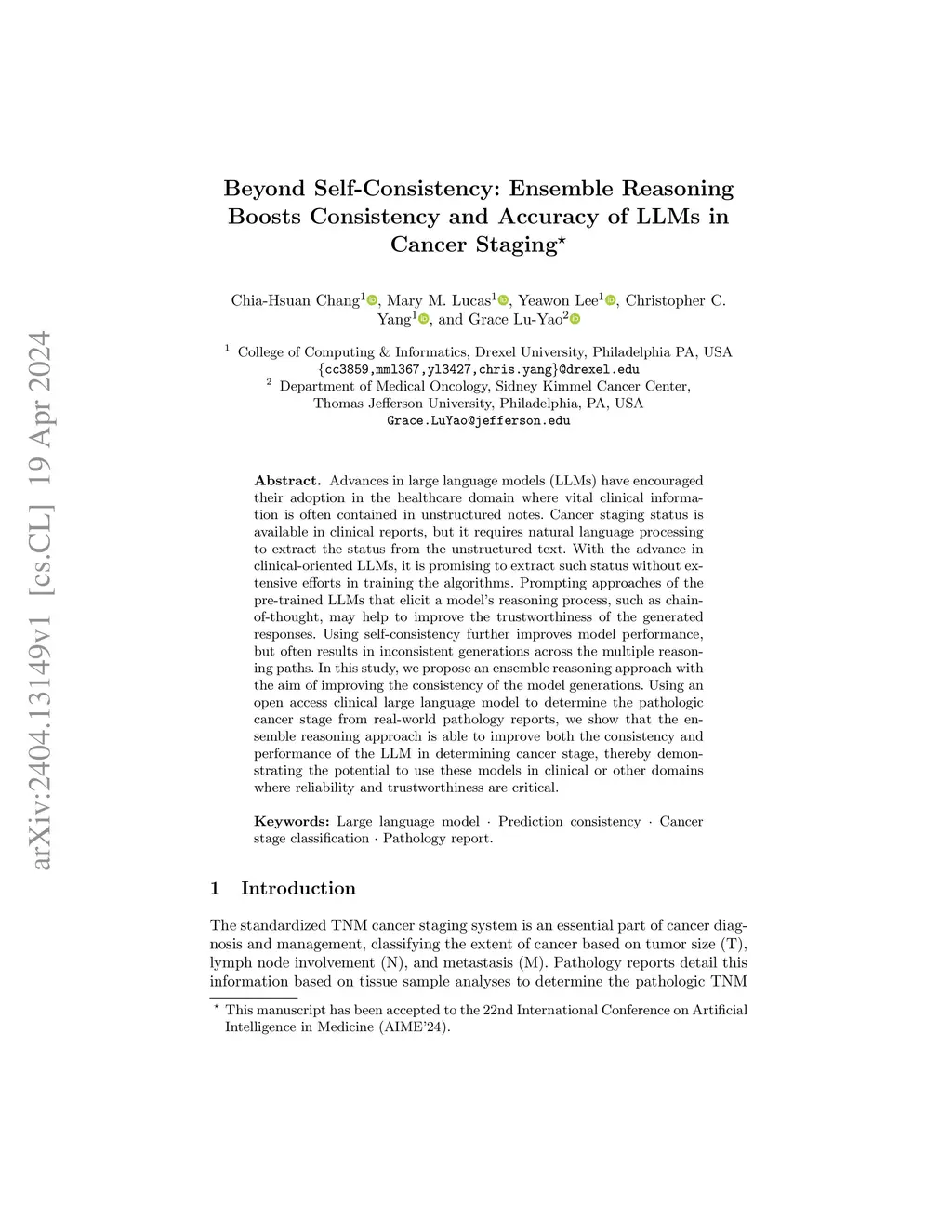 Advances in large language models (LLMs) have encouraged their adoption in the healthcare domain where vital clinical information is often contained in unstructured notes. Cancer staging status is available in clinical reports, but it requires natural language processing to extract the status from the unstructured text. With the advance in clinical-oriented LLMs, it is promising to extract such status without extensive efforts in training the algorithms. Prompting approaches of the pre-trained LLMs that elicit a model's reasoning process, such as chain-of-thought, may help to improve the trustworthiness of the generated responses. Using self-consistency further improves model performance, but often results in inconsistent generations across the multiple reasoning paths. In this study, we propose an ensemble reasoning approach with the aim of improving the consistency of the model generations. Using an open access clinical large language model to determine the pathologic cancer stage from real-world pathology reports, we show that the ensemble reasoning approach is able to improve both the consistency and performance of the LLM in determining cancer stage, thereby demonstrating the potential to use these models in clinical or other domains where reliability and trustworthiness are critical.
