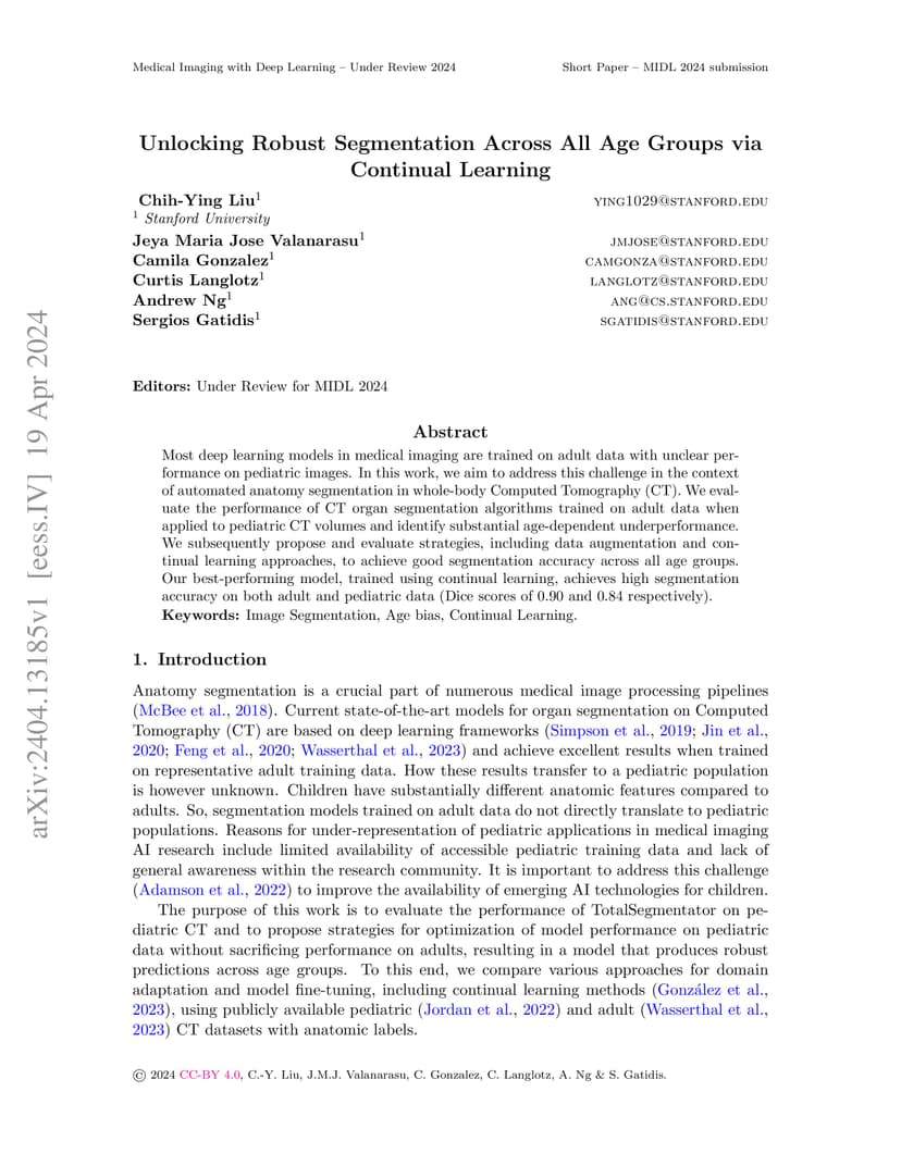 Most deep learning models in medical imaging are trained on adult data with unclear performance on pediatric images. In this work, we aim to address this challenge in the context of automated anatomy segmentation in whole-body Computed Tomography (CT). We evaluate the performance of CT organ segmentation algorithms trained on adult data when applied to pediatric CT volumes and identify substantial age-dependent underperformance. We subsequently propose and evaluate strategies, including data augmentation and continual learning approaches, to achieve good segmentation accuracy across all age groups. Our best-performing model, trained using continual learning, achieves high segmentation accuracy on both adult and pediatric data (Dice scores of 0.90 and 0.84 respectively).