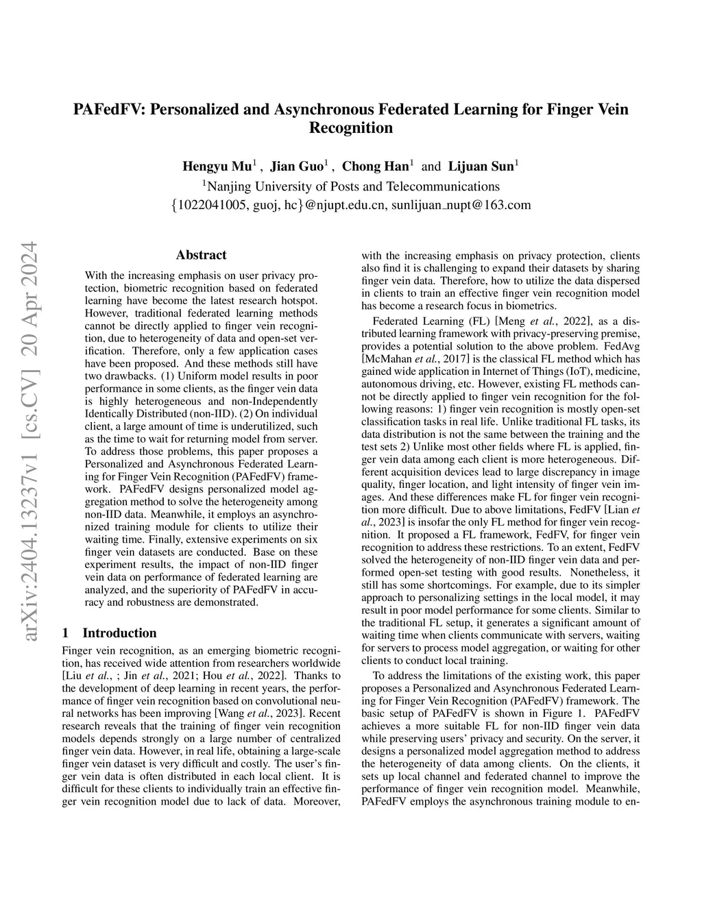 PAFedFV: Personalized and Asynchronous Federated Learning for Finger