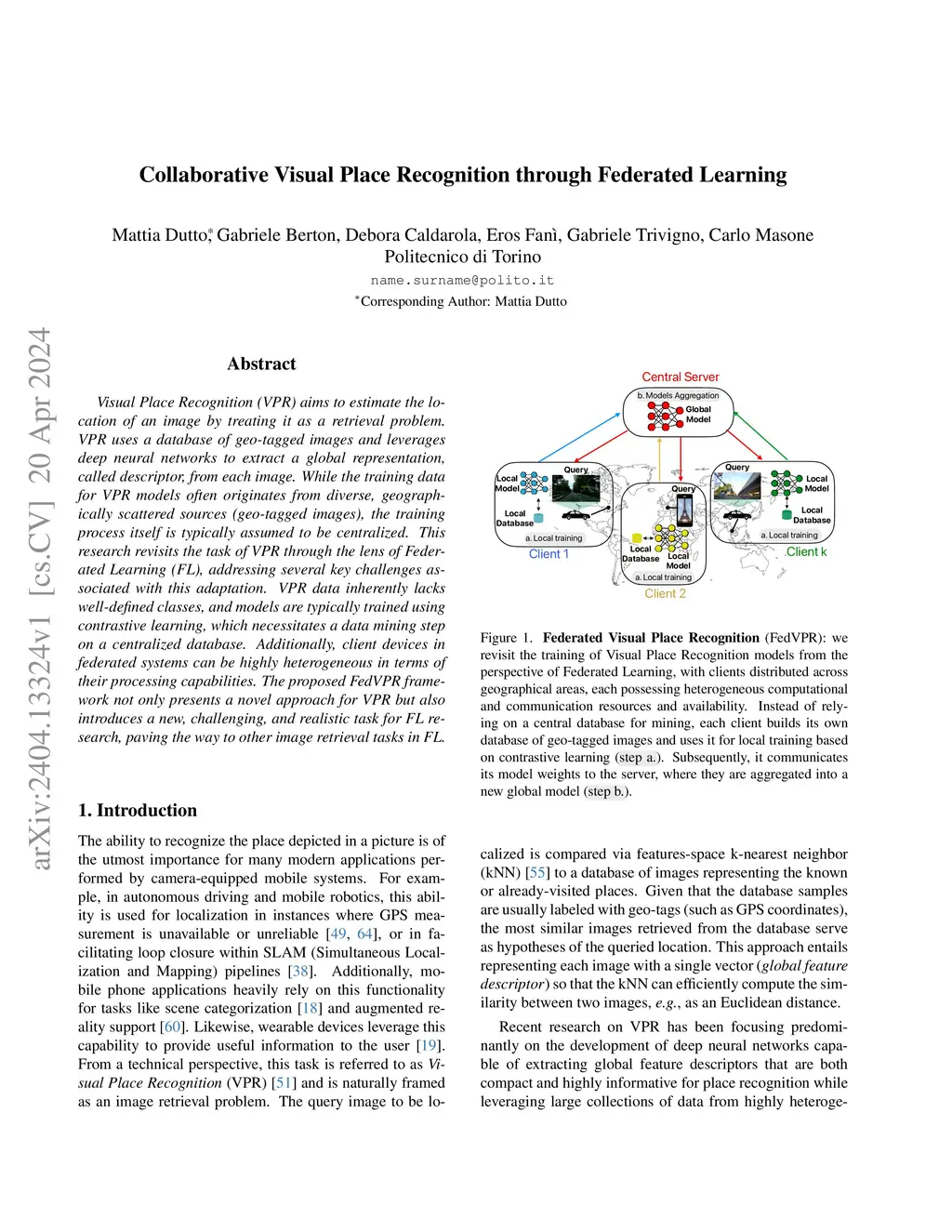 Visual Place Recognition (VPR) aims to estimate the location of an image by treating it as a retrieval problem. VPR uses a database of geo-tagged images and leverages deep neural networks to extract a global representation, called descriptor, from each image. While the training data for VPR models often originates from diverse, geographically scattered sources (geo-tagged images), the training process itself is typically assumed to be centralized. This research revisits the task of VPR through the lens of Federated Learning (FL), addressing several key challenges associated with this adaptation. VPR data inherently lacks well-defined classes, and models are typically trained using contrastive learning, which necessitates a data mining step on a centralized database. Additionally, client devices in federated systems can be highly heterogeneous in terms of their processing capabilities. The proposed FedVPR framework not only presents a novel approach for VPR but also introduces a new, challenging, and realistic task for FL research, paving the way to other image retrieval tasks in FL.