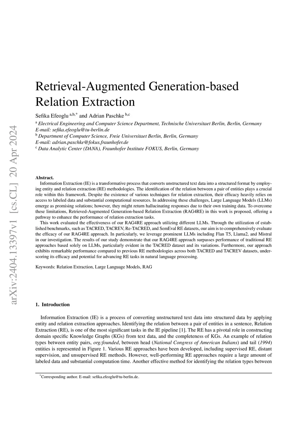 Information Extraction (IE) is a transformative process that converts unstructured text data into a structured format by employing entity and relation extraction (RE) methodologies. The identification of the relation between a pair of entities plays a crucial role within this framework. Despite the existence of various techniques for relation extraction, their efficacy heavily relies on access to labeled data and substantial computational resources. In addressing these challenges, Large Language Models (LLMs) emerge as promising solutions; however, they might return hallucinating responses due to their own training data. To overcome these limitations, Retrieved-Augmented Generation-based Relation Extraction (RAG4RE) in this work is proposed, offering a pathway to enhance the performance of relation extraction tasks.This work evaluated the effectiveness of our RAG4RE approach utilizing different LLMs. Through the utilization of established benchmarks, such as TACRED, TACREV, Re-TACRED, and SemEval RE datasets, our aim is to comprehensively evaluate the efficacy of our RAG4RE approach. In particularly, we leverage prominent LLMs including Flan T5, Llama2, and Mistral in our investigation. The results of our study demonstrate that our RAG4RE approach surpasses performance of traditional RE approaches based solely on LLMs, particularly evident in the TACRED dataset and its variations. Furthermore, our approach exhibits remarkable performance compared to previous RE methodologies across both TACRED and TACREV datasets, underscoring its efficacy and potential for advancing RE tasks in natural language processing.
