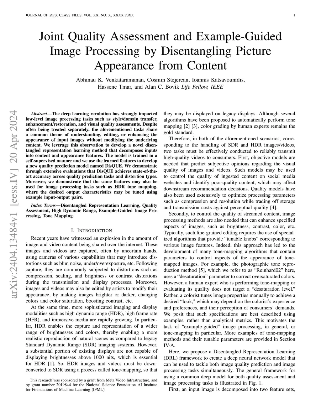 Joint Quality Assessment and Example-Guided Image Processing by Disentangling Picture Appearance from Content