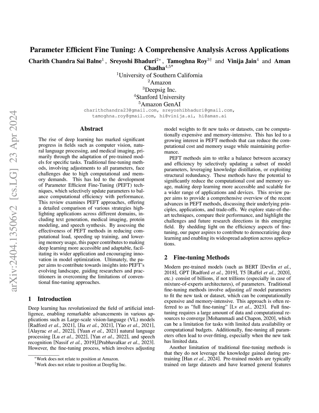 The rise of deep learning has marked significant progress in fields such as computer vision, natural language processing, and medical imaging, primarily through the adaptation of pre-trained models for specific tasks. Traditional fine-tuning methods, involving adjustments to all parameters, face challenges due to high computational and memory demands. This has led to the development of Parameter Efficient Fine-Tuning (PEFT) techniques, which selectively update parameters to balance computational efficiency with performance. This review examines PEFT approaches, offering a detailed comparison of various strategies highlighting applications across different domains, including text generation, medical imaging, protein modeling, and speech synthesis. By assessing the effectiveness of PEFT methods in reducing computational load, speeding up training, and lowering memory usage, this paper contributes to making deep learning more accessible and adaptable, facilitating its wider application and encouraging innovation in model optimization. Ultimately, the paper aims to contribute towards insights into PEFT's evolving landscape, guiding researchers and practitioners in overcoming the limitations of conventional fine-tuning approaches.