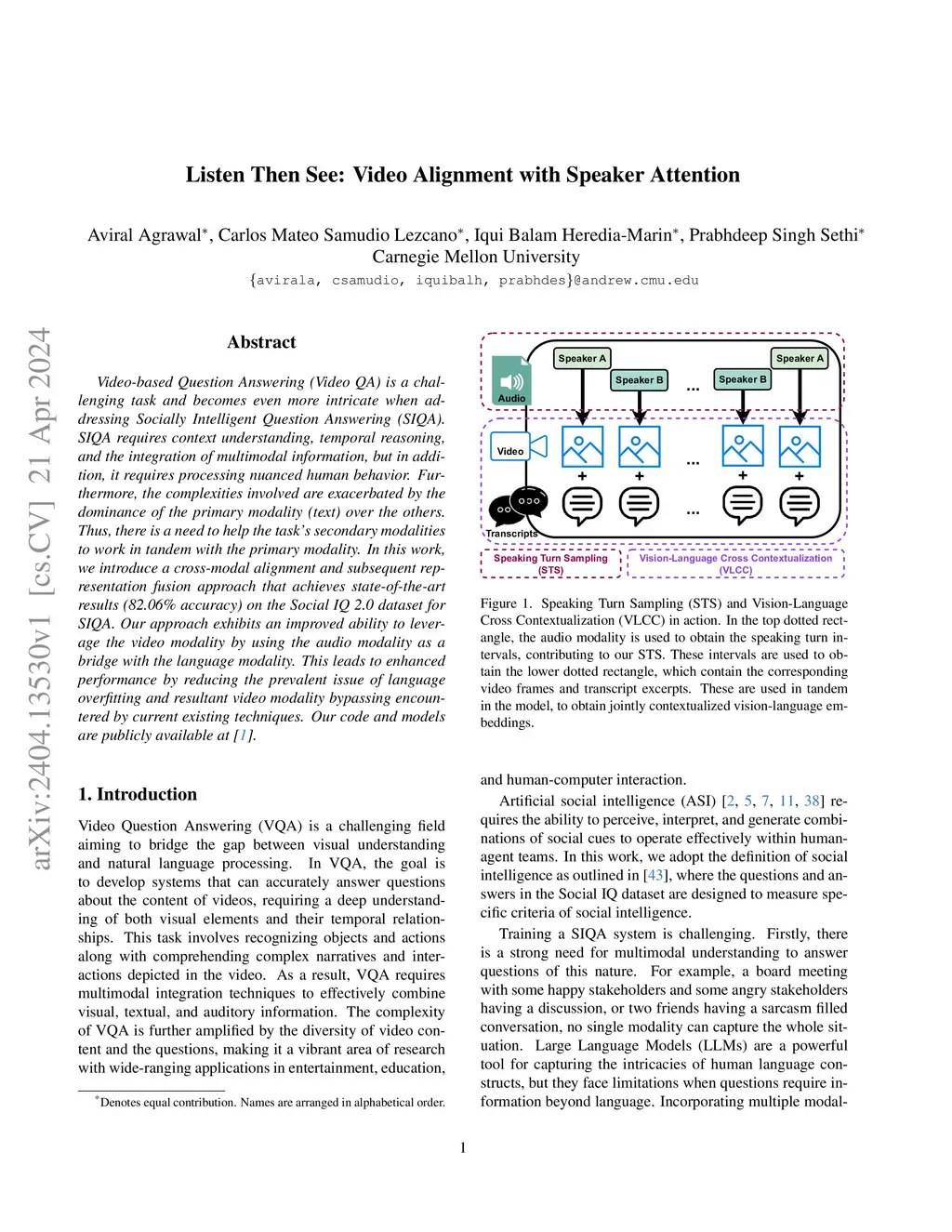 Video-based Question Answering (Video QA) is a challenging task and becomes even more intricate when addressing Socially Intelligent Question Answering (SIQA). SIQA requires context understanding, temporal reasoning, and the integration of multimodal information, but in addition, it requires processing nuanced human behavior. Furthermore, the complexities involved are exacerbated by the dominance of the primary modality (text) over the others. Thus, there is a need to help the task's secondary modalities to work in tandem with the primary modality. In this work, we introduce a cross-modal alignment and subsequent representation fusion approach that achieves state-of-the-art results (82.06\% accuracy) on the Social IQ 2.0 dataset for SIQA. Our approach exhibits an improved ability to leverage the video modality by using the audio modality as a bridge with the language modality. This leads to enhanced performance by reducing the prevalent issue of language overfitting and resultant video modality bypassing encountered by current existing techniques. Our code and models are publicly available at https://github.com/sts-vlcc/sts-vlcc