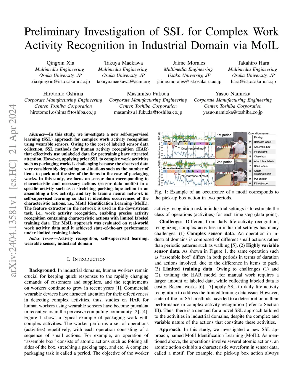 In this study, we investigate a new self-supervised learning (SSL) approach for complex work activity recognition using wearable sensors. Owing to the cost of labeled sensor data collection, SSL methods for human activity recognition (HAR) that effectively use unlabeled data for pretraining have attracted attention. However, applying prior SSL to complex work activities such as packaging works is challenging because the observed data vary considerably depending on situations such as the number of items to pack and the size of the items in the case of packaging works. In this study, we focus on sensor data corresponding to characteristic and necessary actions (sensor data motifs) in a specific activity such as a stretching packing tape action in an assembling a box activity, and \textcolor{black}{try} to train a neural network in self-supervised learning so that it identifies occurrences of the characteristic actions, i.e., Motif Identification Learning (MoIL). The feature extractor in the network is used in the downstream task, i.e., work activity recognition, enabling precise activity recognition containing characteristic actions with limited labeled training data. The MoIL approach was evaluated on real-world work activity data and it achieved state-of-the-art performance under limited training labels.