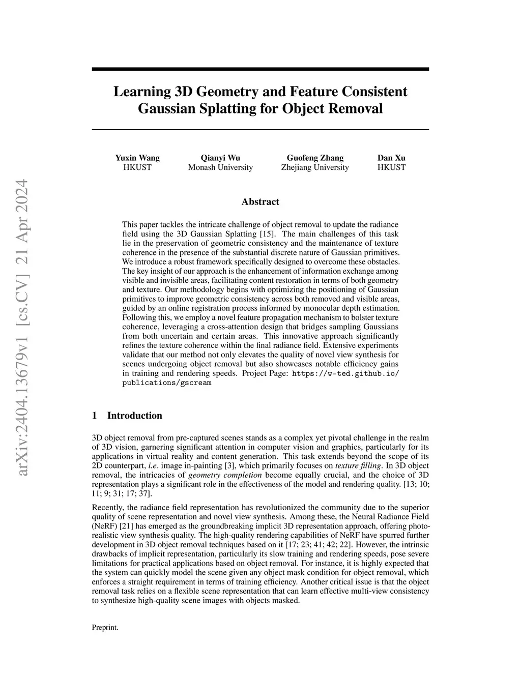 This paper tackles the intricate challenge of object removal to update the radiance field using the 3D Gaussian Splatting. The main challenges of this task lie in the preservation of geometric consistency and the maintenance of texture coherence in the presence of the substantial discrete nature of Gaussian primitives. We introduce a robust framework specifically designed to overcome these obstacles. The key insight of our approach is the enhancement of information exchange among visible and invisible areas, facilitating content restoration in terms of both geometry and texture. Our methodology begins with optimizing the positioning of Gaussian primitives to improve geometric consistency across both removed and visible areas, guided by an online registration process informed by monocular depth estimation. Following this, we employ a novel feature propagation mechanism to bolster texture coherence, leveraging a cross-attention design that bridges sampling Gaussians from both uncertain and certain areas. This innovative approach significantly refines the texture coherence within the final radiance field. Extensive experiments validate that our method not only elevates the quality of novel view synthesis for scenes undergoing object removal but also showcases notable efficiency gains in training and rendering speeds.