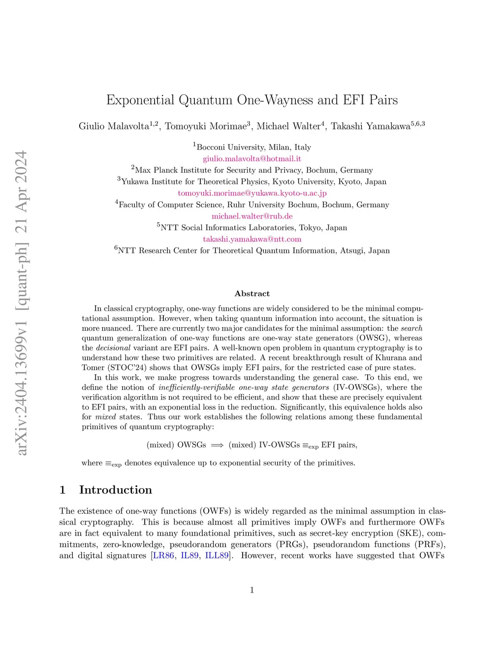 In classical cryptography, one-way functions are widely considered to be the minimal computational assumption. However, when taking quantum information into account, the situation is more nuanced. There are currently two major candidates for the minimal assumption: the search quantum generalization of one-way functions are one-way state generators (OWSG), whereas the decisional variant are EFI pairs. A well-known open problem in quantum cryptography is to understand how these two primitives are related. A recent breakthrough result of Khurana and Tomer (STOC'24) shows that OWSGs imply EFI pairs, for the restricted case of pure states. In this work, we make progress towards understanding the general case. To this end, we define the notion of inefficiently-verifiable one-way state generators (IV-OWSGs), where the verification algorithm is not required to be efficient, and show that these are precisely equivalent to EFI pairs, with an exponential loss in the reduction. Significantly, this equivalence holds also for mixed states. Thus our work establishes the following relations among these fundamental primitives of quantum cryptography: (mixed) OWSGs => (mixed) IV-OWSGs EFI pairs, where denotes equivalence up to exponential security of the primitives.