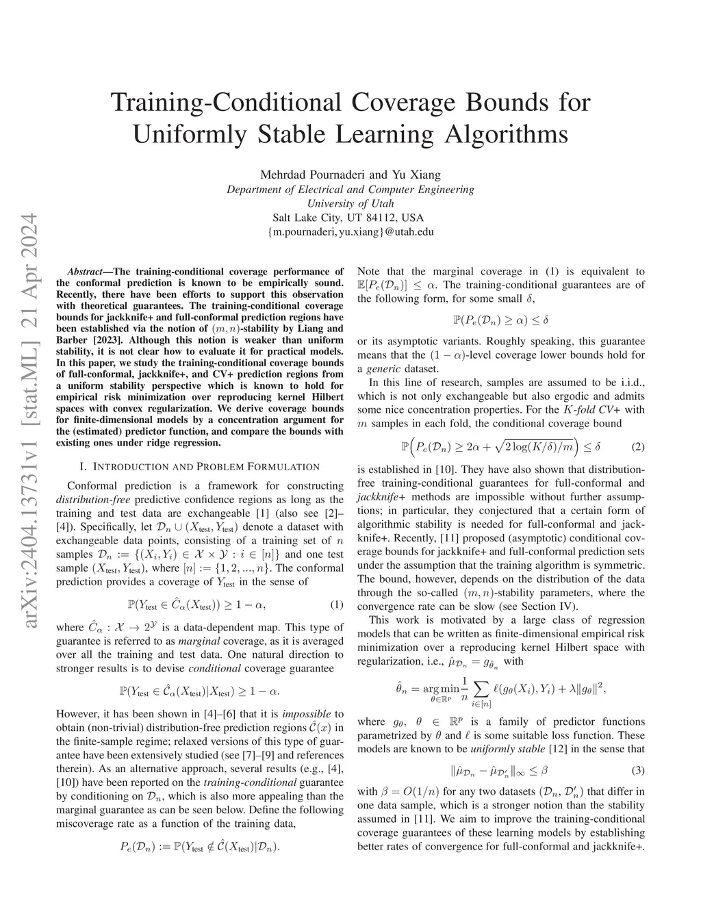 Training-Conditional Coverage Bounds for Uniformly Stable Learning