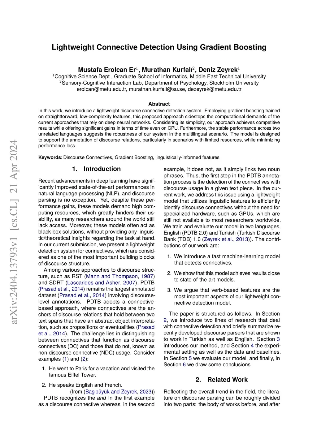 In this work, we introduce a lightweight discourse connective detection system. Employing gradient boosting trained on straightforward, low-complexity features, this proposed approach sidesteps the computational demands of the current approaches that rely on deep neural networks. Considering its simplicity, our approach achieves competitive results while offering significant gains in terms of time even on CPU. Furthermore, the stable performance across two unrelated languages suggests the robustness of our system in the multilingual scenario. The model is designed to support the annotation of discourse relations, particularly in scenarios with limited resources, while minimizing performance loss.
