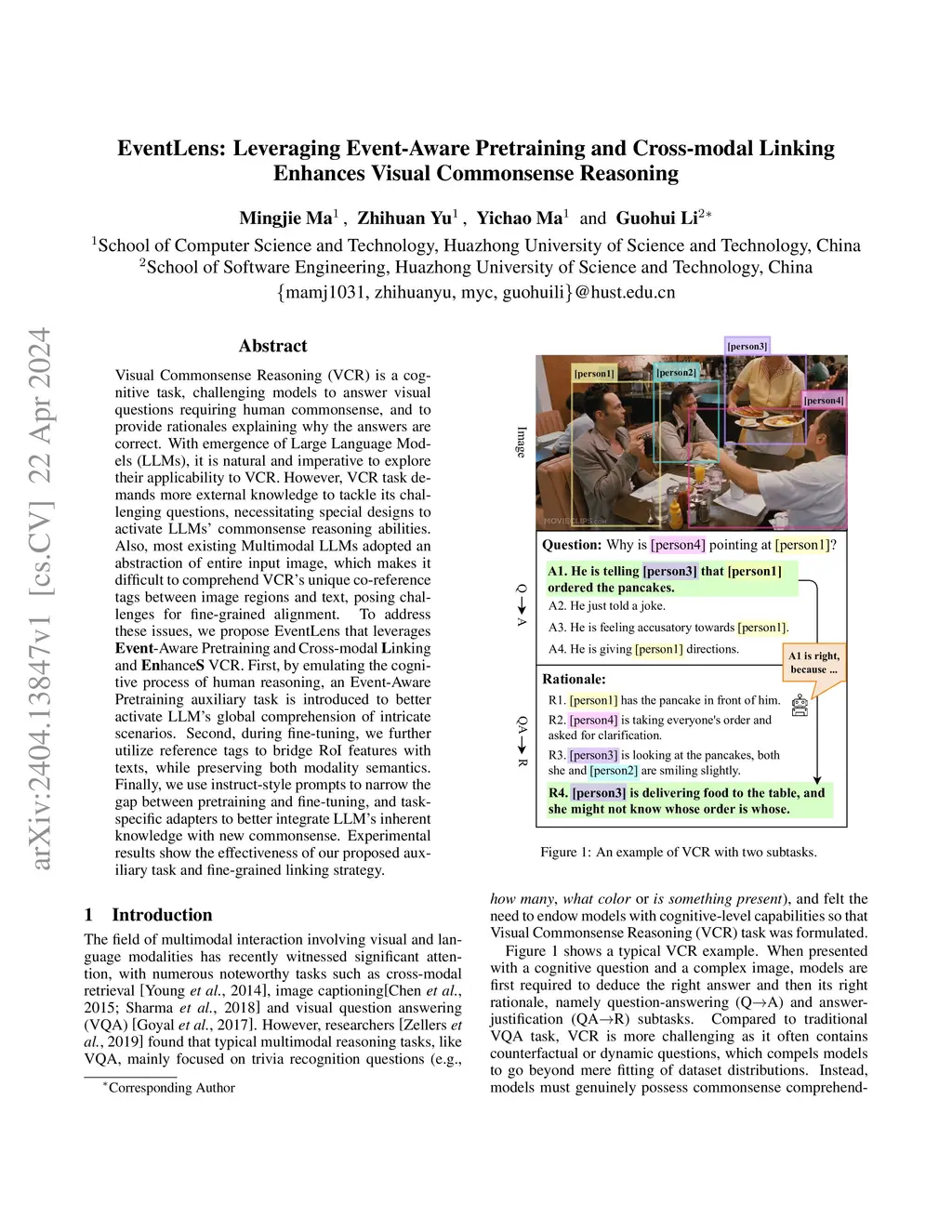 Visual Commonsense Reasoning (VCR) is a cognitive task, challenging models to answer visual questions requiring human commonsense, and to provide rationales explaining why the answers are correct. With emergence of Large Language Models (LLMs), it is natural and imperative to explore their applicability to VCR. However, VCR task demands more external knowledge to tackle its challenging questions, necessitating special designs to activate LLMs' commonsense reasoning abilities. Also, most existing Multimodal LLMs adopted an abstraction of entire input image, which makes it difficult to comprehend VCR's unique co-reference tags between image regions and text, posing challenges for fine-grained alignment. To address these issues, we propose EventLens that leverages Event-Aware Pretraining and Cross-modal Linking and EnhanceS VCR. First, by emulating the cognitive process of human reasoning, an Event-Aware Pretraining auxiliary task is introduced to better activate LLM's global comprehension of intricate scenarios. Second, during fine-tuning, we further utilize reference tags to bridge RoI features with texts, while preserving both modality semantics. Finally, we use instruct-style prompts to narrow the gap between pretraining and fine-tuning, and task-specific adapters to better integrate LLM's inherent knowledge with new commonsense. Experimental results show the effectiveness of our proposed auxiliary task and fine-grained linking strategy.