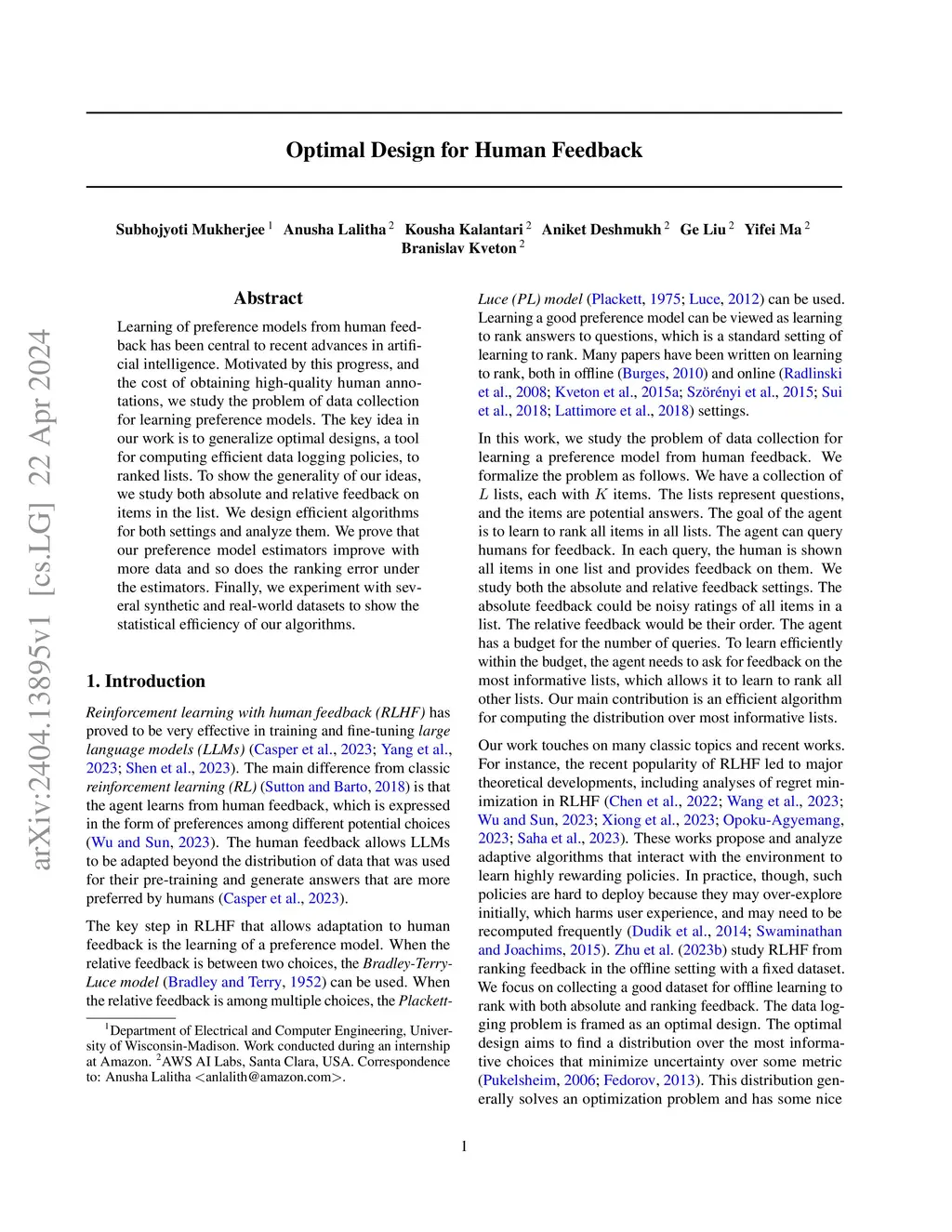 Learning of preference models from human feedback has been central to recent advances in artificial intelligence. Motivated by the cost of obtaining high-quality human annotations, we study efficient human preference elicitation for learning preference models. The key idea in our work is to generalize optimal designs, an approach to computing optimal information-gathering policies, to lists of items that represent potential questions with answers. The policy is a distribution over the lists and we elicit preferences from them proportionally to their probabilities. To show the generality of our ideas, we study both absolute and ranking feedback models on items in the list. We design efficient algorithms for both and analyze them. Finally, we demonstrate that our algorithms are practical by evaluating them on existing question-answering problems.