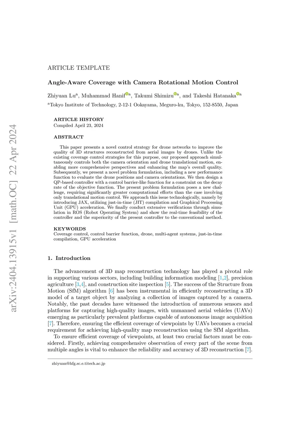 This paper presents a novel control strategy for drone networks to improve the quality of 3D structures reconstructed from aerial images by drones. Unlike the existing coverage control strategies for this purpose, our proposed approach simultaneously controls both the camera orientation and drone translational motion, enabling more comprehensive perspectives and enhancing the map's overall quality. Subsequently, we present a novel problem formulation, including a new performance function to evaluate the drone positions and camera orientations. We then design a QP-based controller with a control barrier-like function for a constraint on the decay rate of the objective function. The present problem formulation poses a new challenge, requiring significantly greater computational efforts than the case involving only translational motion control. We approach this issue technologically, namely by introducing JAX, utilizing just-in-time (JIT) compilation and Graphical Processing Unit (GPU) acceleration. We finally conduct extensive verifications through simulation in ROS (Robot Operating System) and show the real-time feasibility of the controller and the superiority of the present controller to the conventional method.