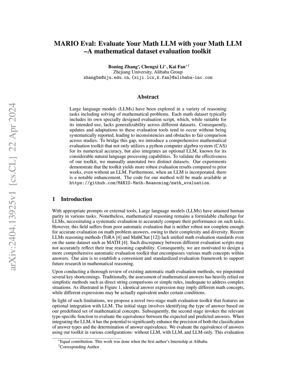 Large language models (LLMs) have been explored in a variety of reasoning tasks including solving of mathematical problems. Each math dataset typically includes its own specially designed evaluation script, which, while suitable for its intended use, lacks generalizability across different datasets. Consequently, updates and adaptations to these evaluation tools tend to occur without being systematically reported, leading to inconsistencies and obstacles to fair comparison across studies. To bridge this gap, we introduce a comprehensive mathematical evaluation toolkit that not only utilizes a python computer algebra system (CAS) for its numerical accuracy, but also integrates an optional LLM, known for its considerable natural language processing capabilities. To validate the effectiveness of our toolkit, we manually annotated two distinct datasets. Our experiments demonstrate that the toolkit yields more robust evaluation results compared to prior works, even without an LLM. Furthermore, when an LLM is incorporated, there is a notable enhancement. The code for our method will be made available at \url{https://github.com/MARIO-Math-Reasoning/math_evaluation}.