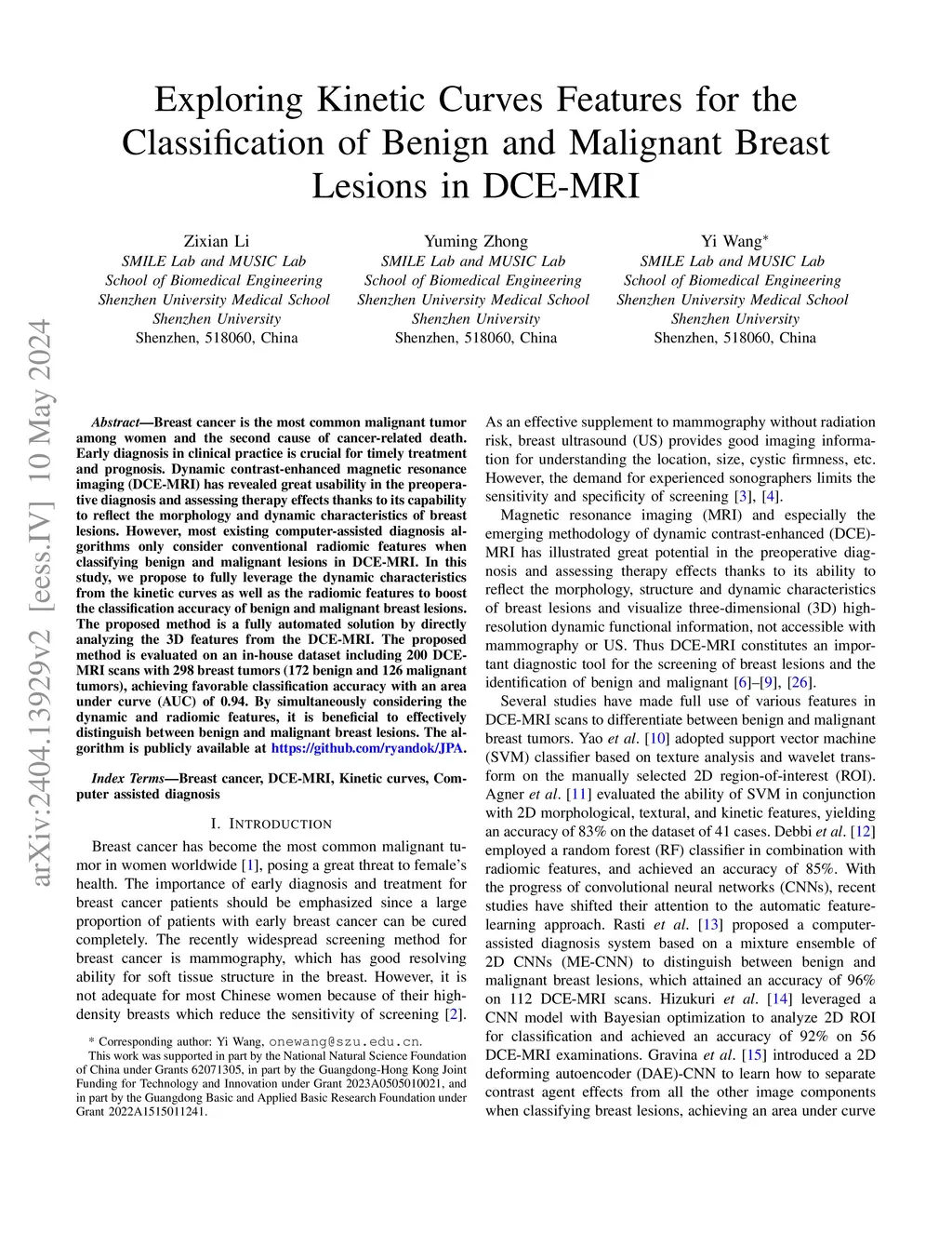 Breast cancer is the most common malignant tumor among women and the second cause of cancer-related death. Early diagnosis in clinical practice is crucial for timely treatment and prognosis. Dynamic contrast-enhanced magnetic resonance imaging (DCE-MRI) has revealed great usability in the preoperative diagnosis and assessing therapy effects thanks to its capability to reflect the morphology and dynamic characteristics of breast lesions. However, most existing computer-assisted diagnosis algorithms only consider conventional radiomic features when classifying benign and malignant lesions in DCE-MRI. In this study, we propose to fully leverage the dynamic characteristics from the kinetic curves as well as the radiomic features to boost the classification accuracy of benign and malignant breast lesions. The proposed method is a fully automated solution by directly analyzing the 3D features from the DCE-MRI. The proposed method is evaluated on an in-house dataset including 200 DCE-MRI scans with 298 breast tumors (172 benign and 126 malignant tumors), achieving favorable classification accuracy with an area under curve (AUC) of 0.94. By simultaneously considering the dynamic and radiomic features, it is beneficial to effectively distinguish between benign and malignant breast lesions. The algorithm is publicly available at https://github.com/ryandok/JPA.
