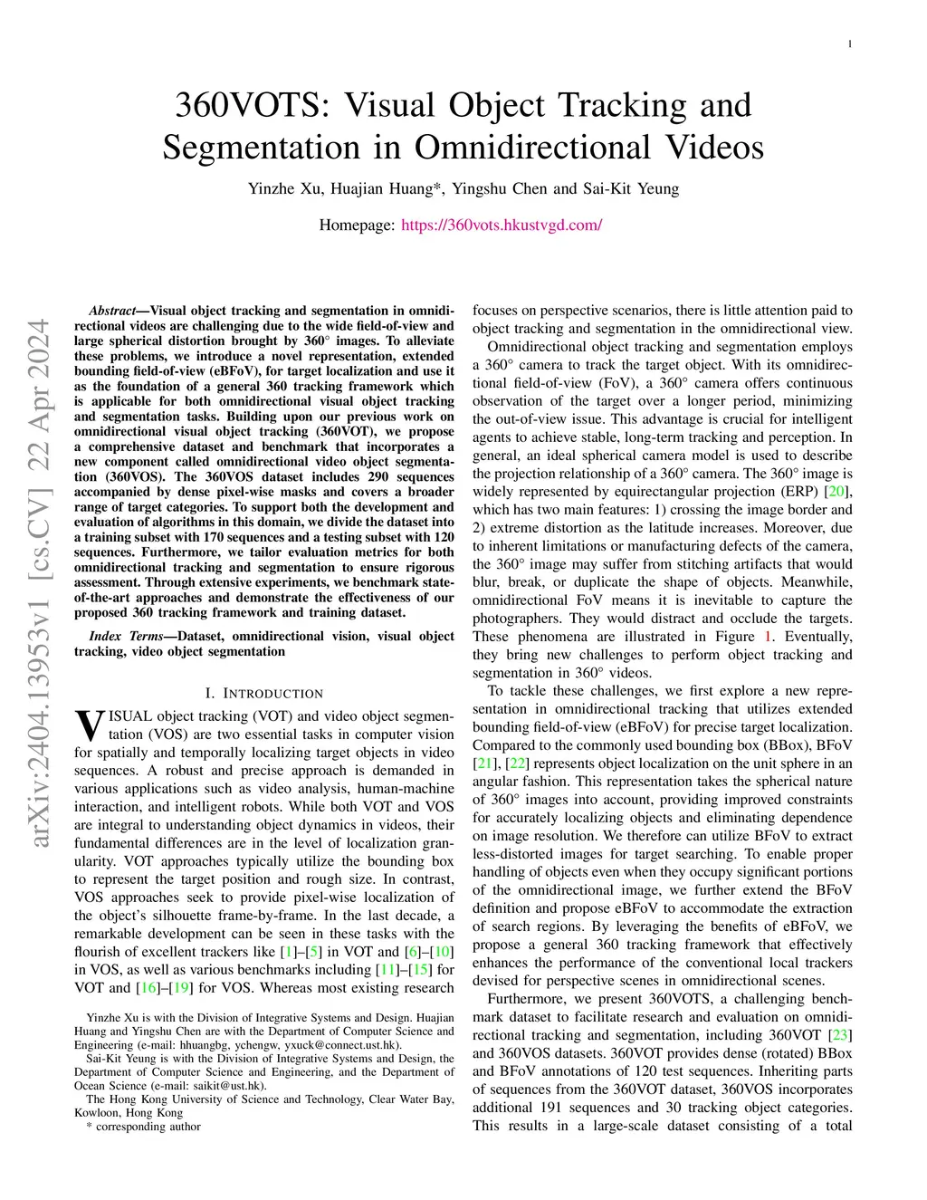 Visual object tracking and segmentation in omnidirectional videos are challenging due to the wide field-of-view and large spherical distortion brought by 360° images. To alleviate these problems, we introduce a novel representation, extended bounding field-of-view (eBFoV), for target localization and use it as the foundation of a general 360 tracking framework which is applicable for both omnidirectional visual object tracking and segmentation tasks. Building upon our previous work on omnidirectional visual object tracking (360VOT), we propose a comprehensive dataset and benchmark that incorporates a new component called omnidirectional video object segmentation (360VOS). The 360VOS dataset includes 290 sequences accompanied by dense pixel-wise masks and covers a broader range of target categories. To support both the development and evaluation of algorithms in this domain, we divide the dataset into a training subset with 170 sequences and a testing subset with 120 sequences. Furthermore, we tailor evaluation metrics for both omnidirectional tracking and segmentation to ensure rigorous assessment. Through extensive experiments, we benchmark state-of-the-art approaches and demonstrate the effectiveness of our proposed 360 tracking framework and training dataset. Homepage:this https URL