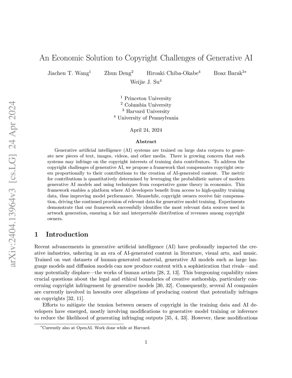 Generative artificial intelligence (AI) systems are trained on large data corpora to generate new pieces of text, images, videos, and other media. There is growing concern that such systems may infringe on the copyright interests of training data contributors. To address the copyright challenges of generative AI, we propose a framework that compensates copyright owners proportionally to their contributions to the creation of AI-generated content. The metric for contributions is quantitatively determined by leveraging the probabilistic nature of modern generative AI models and using techniques from cooperative game theory in economics. This framework enables a platform where AI developers benefit from access to high-quality training data, thus improving model performance. Meanwhile, copyright owners receive fair compensation, driving the continued provision of relevant data for generative model training. Experiments demonstrate that our framework successfully identifies the most relevant data sources used in artwork generation, ensuring a fair and interpretable distribution of revenues among copyright owners.