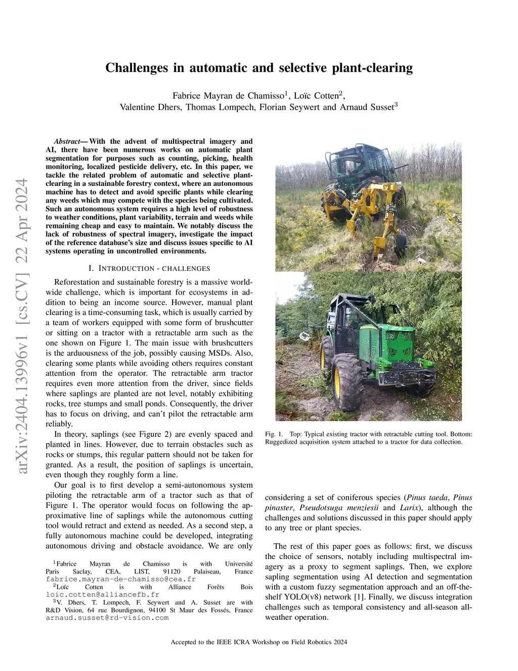 With the advent of multispectral imagery and AI, there have been numerous works on automatic plant segmentation for purposes such as counting, picking, health monitoring, localized pesticide delivery, etc. In this paper, we tackle the related problem of automatic and selective plant-clearing in a sustainable forestry context, where an autonomous machine has to detect and avoid specific plants while clearing any weeds which may compete with the species being cultivated. Such an autonomous system requires a high level of robustness to weather conditions, plant variability, terrain and weeds while remaining cheap and easy to maintain. We notably discuss the lack of robustness of spectral imagery, investigate the impact of the reference database's size and discuss issues specific to AI systems operating in uncontrolled environments.