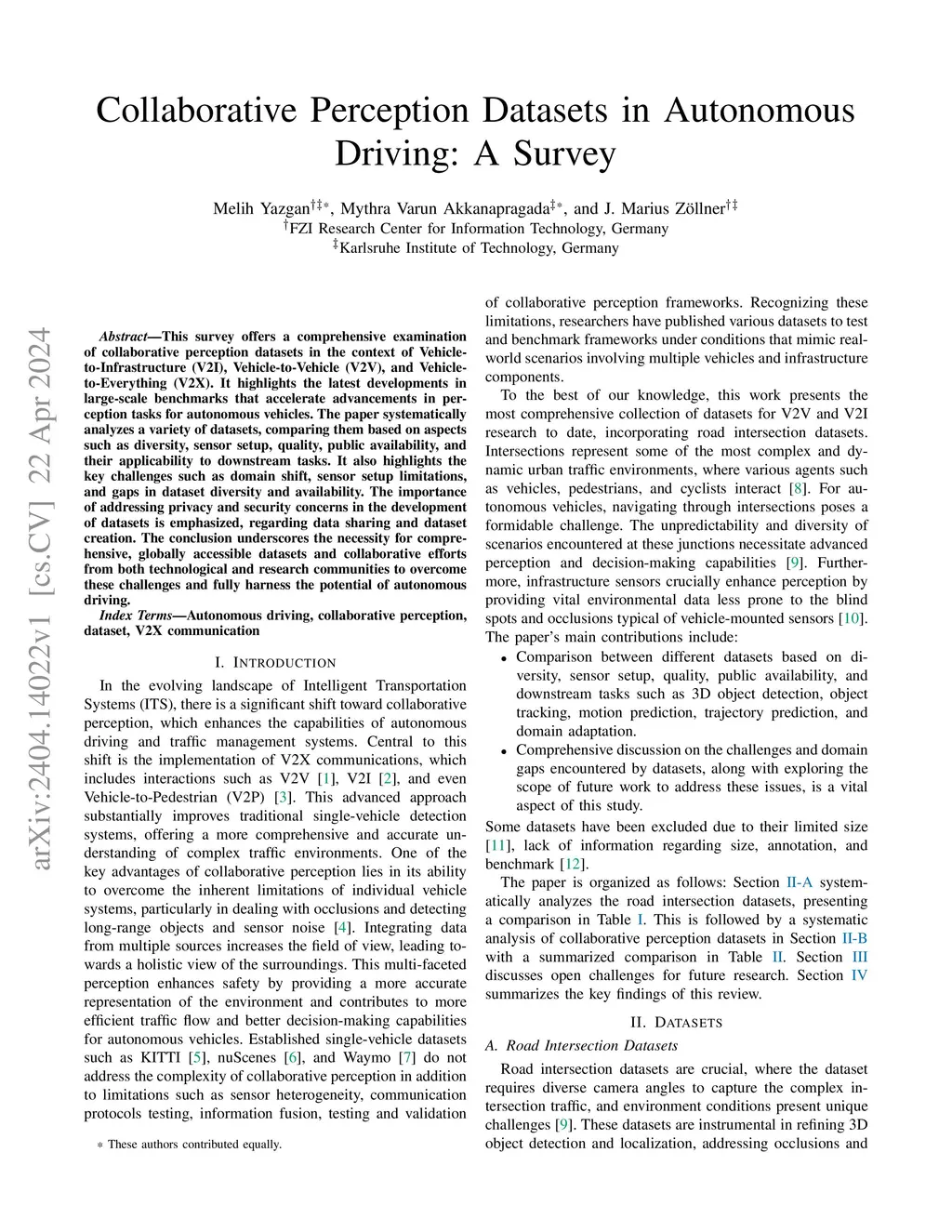 This survey offers a comprehensive examination of collaborative perception datasets in the context of Vehicle-to-Infrastructure (V2I), Vehicle-to-Vehicle (V2V), and Vehicle-to-Everything (V2X). It highlights the latest developments in large-scale benchmarks that accelerate advancements in perception tasks for autonomous vehicles. The paper systematically analyzes a variety of datasets, comparing them based on aspects such as diversity, sensor setup, quality, public availability, and their applicability to downstream tasks. It also highlights the key challenges such as domain shift, sensor setup limitations, and gaps in dataset diversity and availability. The importance of addressing privacy and security concerns in the development of datasets is emphasized, regarding data sharing and dataset creation. The conclusion underscores the necessity for comprehensive, globally accessible datasets and collaborative efforts from both technological and research communities to overcome these challenges and fully harness the potential of autonomous driving.
