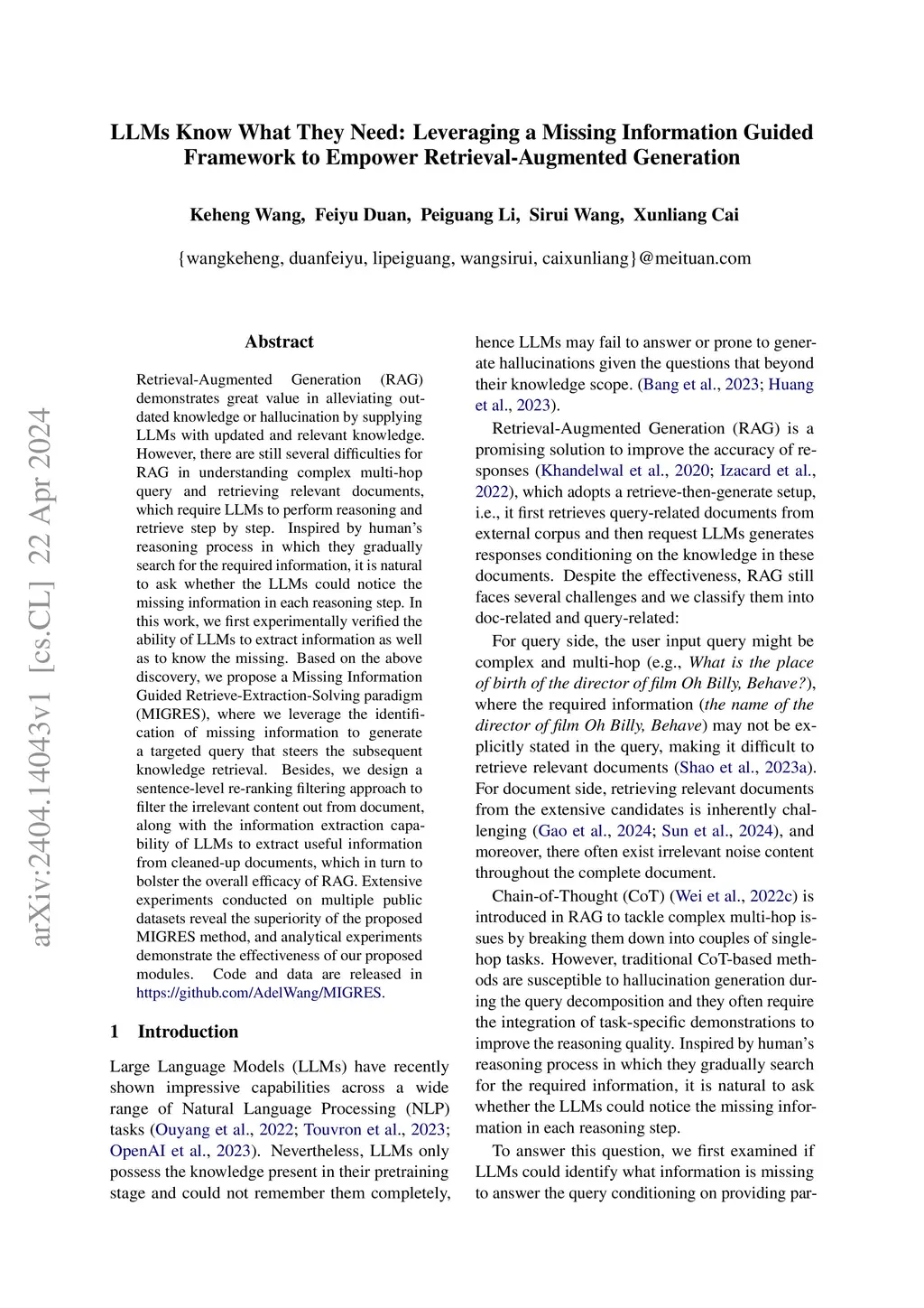 Retrieval-Augmented Generation (RAG) demonstrates great value in alleviating outdated knowledge or hallucination by supplying LLMs with updated and relevant knowledge. However, there are still several difficulties for RAG in understanding complex multi-hop query and retrieving relevant documents, which require LLMs to perform reasoning and retrieve step by step. Inspired by human's reasoning process in which they gradually search for the required information, it is natural to ask whether the LLMs could notice the missing information in each reasoning step. In this work, we first experimentally verified the ability of LLMs to extract information as well as to know the missing. Based on the above discovery, we propose a Missing Information Guided Retrieve-Extraction-Solving paradigm (MIGRES), where we leverage the identification of missing information to generate a targeted query that steers the subsequent knowledge retrieval. Besides, we design a sentence-level re-ranking filtering approach to filter the irrelevant content out from document, along with the information extraction capability of LLMs to extract useful information from cleaned-up documents, which in turn to bolster the overall efficacy of RAG. Extensive experiments conducted on multiple public datasets reveal the superiority of the proposed MIGRES method, and analytical experiments demonstrate the effectiveness of our proposed modules.