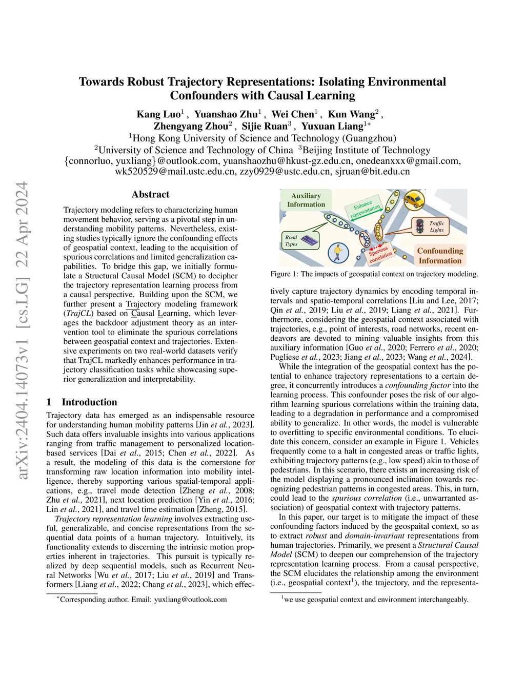 Trajectory modeling refers to characterizing human movement behavior, serving as a pivotal step in understanding mobility patterns. Nevertheless, existing studies typically ignore the confounding effects of geospatial context, leading to the acquisition of spurious correlations and limited generalization capabilities. To bridge this gap, we initially formulate a Structural Causal Model (SCM) to decipher the trajectory representation learning process from a causal perspective. Building upon the SCM, we further present a Trajectory modeling framework (TrajCL) based on Causal Learning, which leverages the backdoor adjustment theory as an intervention tool to eliminate the spurious correlations between geospatial context and trajectories. Extensive experiments on two real-world datasets verify that TrajCL markedly enhances performance in trajectory classification tasks while showcasing superior generalization and interpretability.