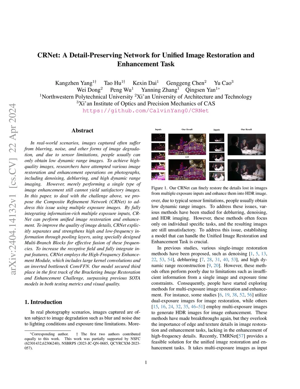 In real-world scenarios, images captured often suffer from blurring, noise, and other forms of image degradation, and due to sensor limitations, people usually can only obtain low dynamic range images. To achieve high-quality images, researchers have attempted various image restoration and enhancement operations on photographs, including denoising, deblurring, and high dynamic range imaging. However, merely performing a single type of image enhancement still cannot yield satisfactory images. In this paper, to deal with the challenge above, we propose the Composite Refinement Network (CRNet) to address this issue using multiple exposure images. By fully integrating information-rich multiple exposure inputs, CRNet can perform unified image restoration and enhancement. To improve the quality of image details, CRNet explicitly separates and strengthens high and low-frequency information through pooling layers, using specially designed Multi-Branch Blocks for effective fusion of these frequencies. To increase the receptive field and fully integrate input features, CRNet employs the High-Frequency Enhancement Module, which includes large kernel convolutions and an inverted bottleneck ConvFFN. Our model secured third place in the first track of the Bracketing Image Restoration and Enhancement Challenge, surpassing previous SOTA models in both testing metrics and visual quality.