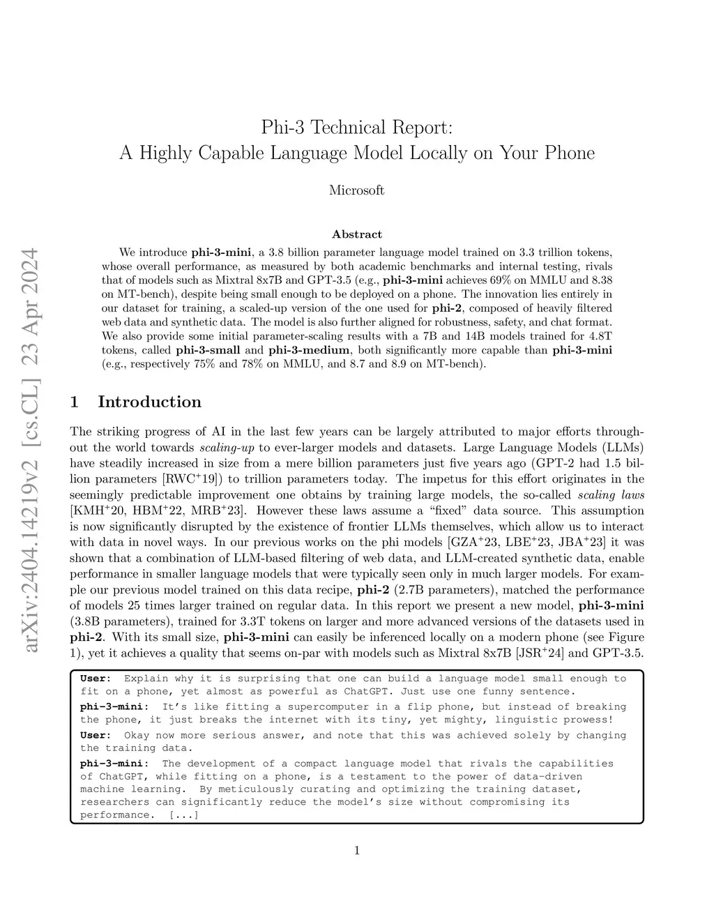 We introduce phi-3-mini, a 3.8 billion parameter language model trained on 3.3 trillion tokens, whose overall performance, as measured by both academic benchmarks and internal testing, rivals that of models such as Mixtral 8x7B and GPT-3.5 (e.g., phi-3-mini achieves 69% on MMLU and 8.38 on MT-bench), despite being small enough to be deployed on a phone. The innovation lies entirely in our dataset for training, a scaled-up version of the one used for phi-2, composed of heavily filtered web data and synthetic data. The model is also further aligned for robustness, safety, and chat format. We also provide some initial parameter-scaling results with a 7B and 14B models trained for 4.8T tokens, called phi-3-small and phi-3-medium, both significantly more capable than phi-3-mini (e.g., respectively 75% and 78% on MMLU, and 8.7 and 8.9 on MT-bench).