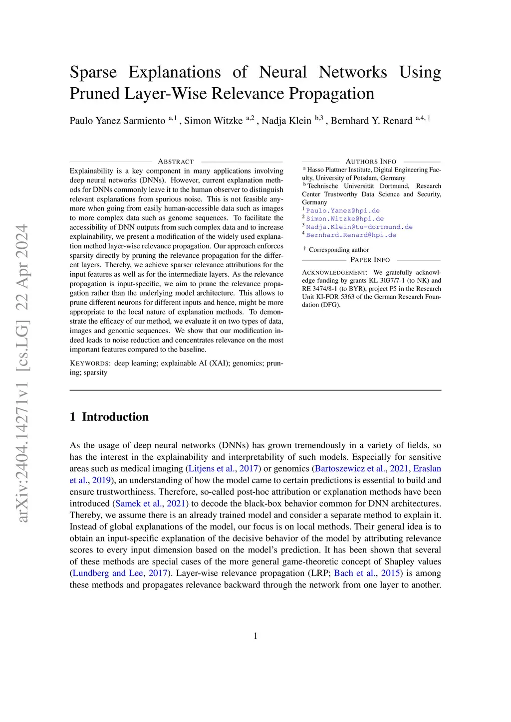 Explainability is a key component in many applications involving deep neural networks (DNNs). However, current explanation methods for DNNs commonly leave it to the human observer to distinguish relevant explanations from spurious noise. This is not feasible anymore when going from easily human-accessible data such as images to more complex data such as genome sequences. To facilitate the accessibility of DNN outputs from such complex data and to increase explainability, we present a modification of the widely used explanation method layer-wise relevance propagation. Our approach enforces sparsity directly by pruning the relevance propagation for the different layers. Thereby, we achieve sparser relevance attributions for the input features as well as for the intermediate layers. As the relevance propagation is input-specific, we aim to prune the relevance propagation rather than the underlying model architecture. This allows to prune different neurons for different inputs and hence, might be more appropriate to the local nature of explanation methods. To demonstrate the efficacy of our method, we evaluate it on two types of data: images and genome sequences. We show that our modification indeed leads to noise reduction and concentrates relevance on the most important features compared to the baseline.
