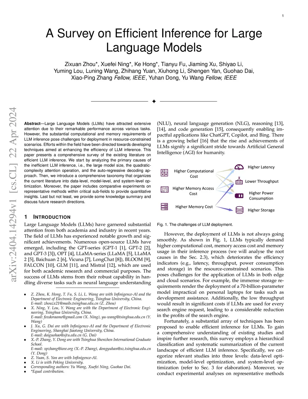 Large Language Models (LLMs) have attracted extensive attention due to their remarkable performance across various tasks. However, the substantial computational and memory requirements of LLM inference pose challenges for deployment in resource-constrained scenarios. Efforts within the field have been directed towards developing techniques aimed at enhancing the efficiency of LLM inference. This paper presents a comprehensive survey of the existing literature on efficient LLM inference. We start by analyzing the primary causes of the inefficient LLM inference, i.e., the large model size, the quadratic-complexity attention operation, and the auto-regressive decoding approach. Then, we introduce a comprehensive taxonomy that organizes the current literature into data-level, model-level, and system-level optimization. Moreover, the paper includes comparative experiments on representative methods within critical sub-fields to provide quantitative insights. Last but not least, we provide some knowledge summary and discuss future research directions.