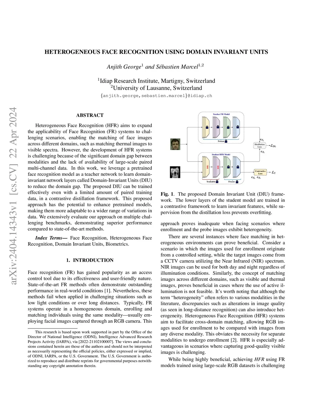 Heterogeneous Face Recognition (HFR) aims to expand the applicability of Face Recognition (FR) systems to challenging scenarios, enabling the matching of face images across different domains, such as matching thermal images to visible spectra. However, the development of HFR systems is challenging because of the significant domain gap between modalities and the lack of availability of large-scale paired multi-channel data. In this work, we leverage a pretrained face recognition model as a teacher network to learn domaininvariant network layers called Domain-Invariant Units (DIU) to reduce the domain gap. The proposed DIU can be trained effectively even with a limited amount of paired training data, in a contrastive distillation framework. This proposed approach has the potential to enhance pretrained models, making them more adaptable to a wider range of variations in data. We extensively evaluate our approach on multiple challenging benchmarks, demonstrating superior performance compared to state-of-the-art methods.