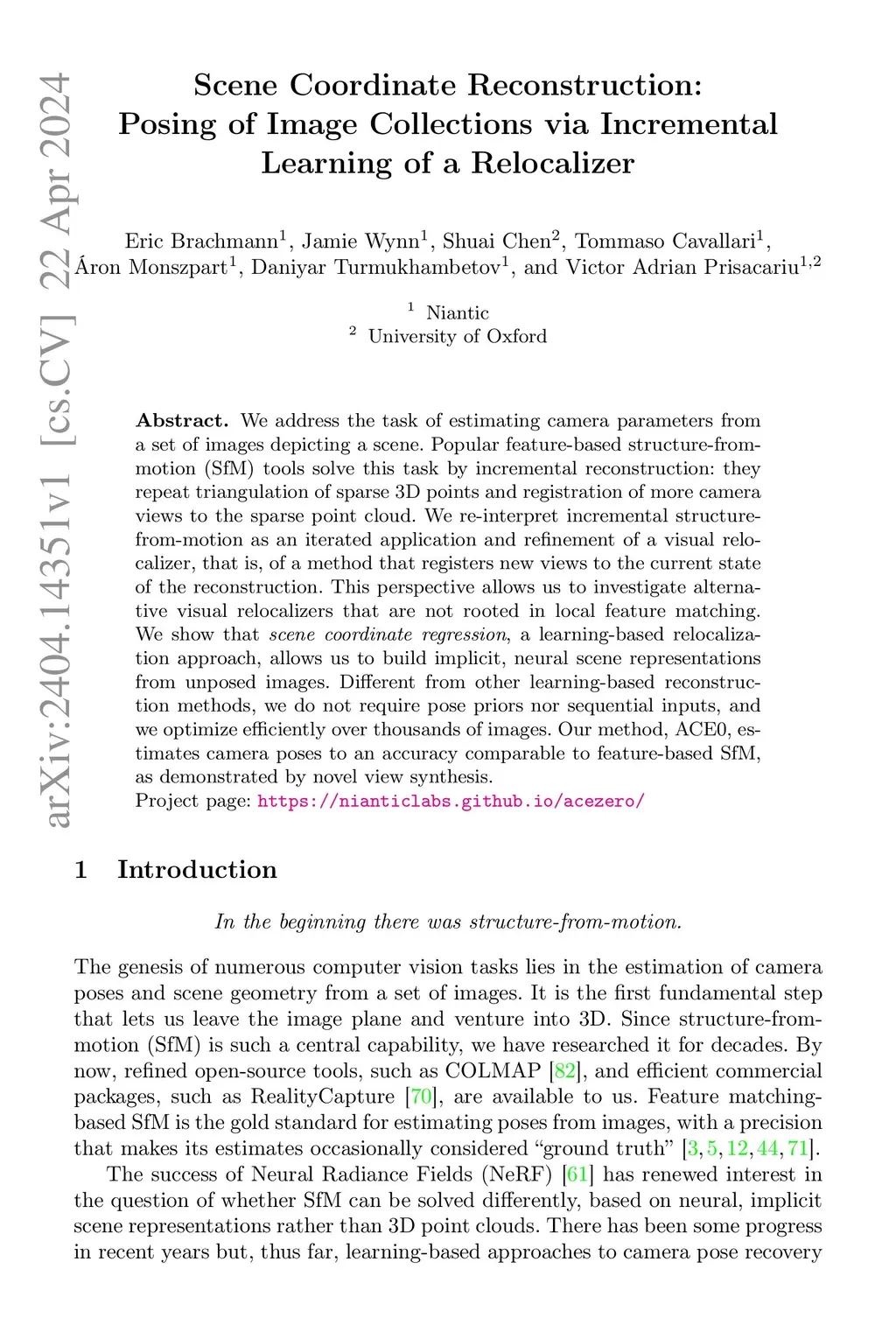 We address the task of estimating camera parameters from a set of images depicting a scene. Popular feature-based structure-from-motion (SfM) tools solve this task by incremental reconstruction: they repeat triangulation of sparse 3D points and registration of more camera views to the sparse point cloud. We re-interpret incremental structure-from-motion as an iterated application and refinement of a visual relocalizer, that is, of a method that registers new views to the current state of the reconstruction. This perspective allows us to investigate alternative visual relocalizers that are not rooted in local feature matching. We show that scene coordinate regression, a learning-based relocalization approach, allows us to build implicit, neural scene representations from unposed images. Different from other learning-based reconstruction methods, we do not require pose priors nor sequential inputs, and we optimize efficiently over thousands of images. Our method, ACE0 (ACE Zero), estimates camera poses to an accuracy comparable to feature-based SfM, as demonstrated by novel view synthesis. Project page: https://nianticlabs.github.io/acezero/