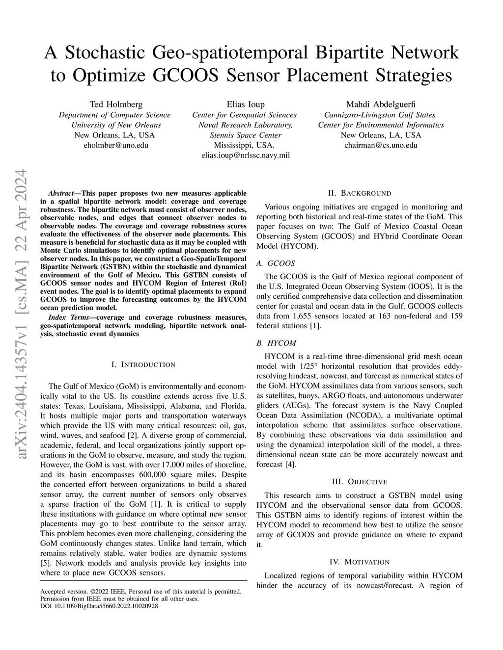 This paper proposes two new measures applicable in a spatial bipartite network model: coverage and coverage robustness. The bipartite network must consist of observer nodes, observable nodes, and edges that connect observer nodes to observable nodes. The coverage and coverage robustness scores evaluate the effectiveness of the observer node placements. This measure is beneficial for stochastic data as it may be coupled with Monte Carlo simulations to identify optimal placements for new observer nodes. In this paper, we construct a Geo-SpatioTemporal Bipartite Network (GSTBN) within the stochastic and dynamical environment of the Gulf of Mexico. This GSTBN consists of GCOOS sensor nodes and HYCOM Region of Interest (RoI) event nodes. The goal is to identify optimal placements to expand GCOOS to improve the forecasting outcomes by the HYCOM ocean prediction model.