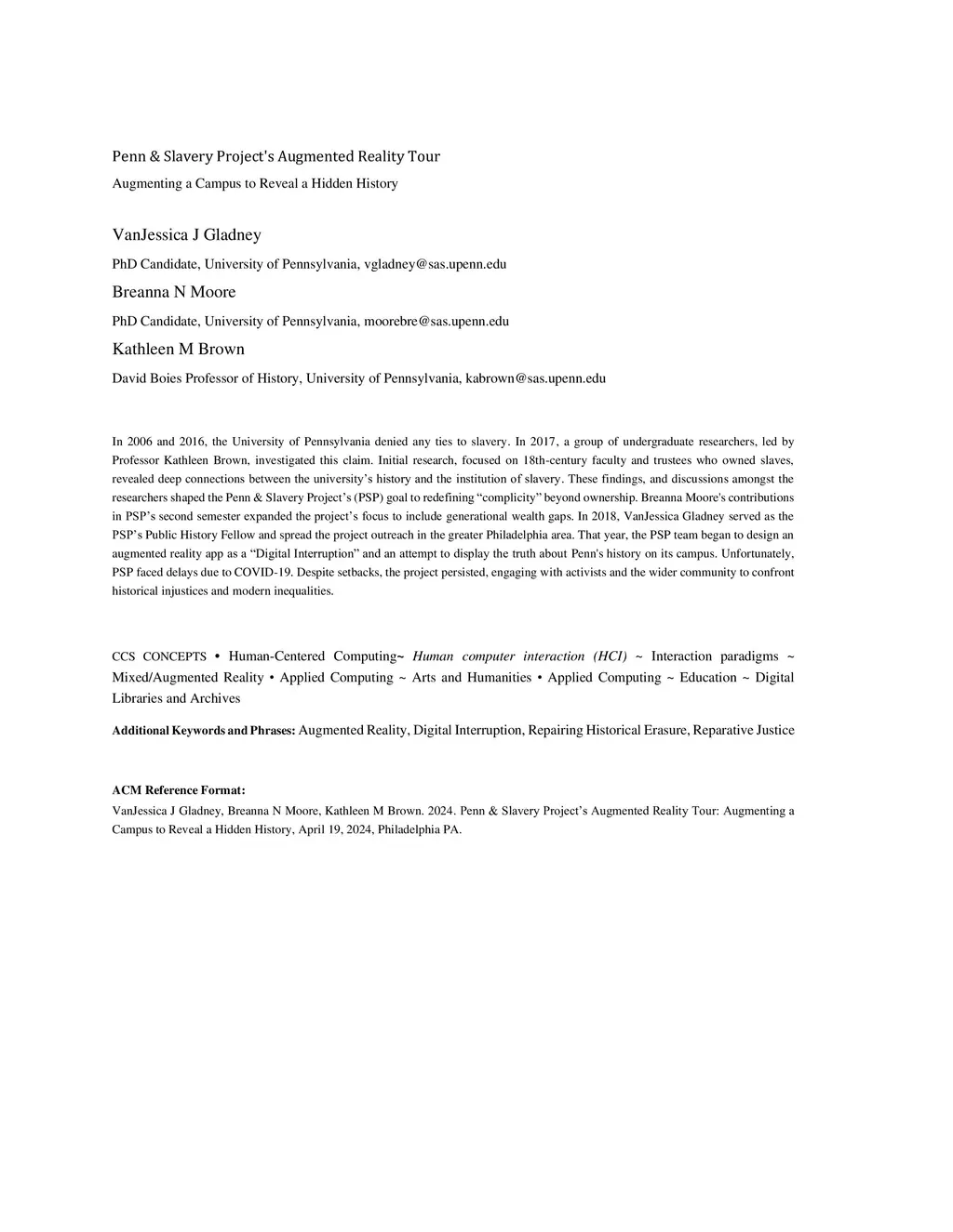 In 2006 and 2016, the University of Pennsylvania denied any ties to slavery. In 2017, a group of undergraduate researchers, led by Professor Kathleen Brown, investigated this claim. Initial research, focused on 18th century faculty and trustees who owned slaves, revealed deep connections between the university's history and the institution of slavery. These findings, and discussions amongst the researchers shaped the Penn and Slavery Project's goal of redefining complicity beyond ownership. Breanna Moore's contributions in PSP's second semester expanded the project's focus to include generational wealth gaps. In 2018, VanJessica Gladney served as the PSP's Public History Fellow and spread the project outreach in the greater Philadelphia area. That year, the PSP team began to design an augmented reality app as a Digital Interruption and an attempt to display the truth about Penn's history on its campus. Unfortunately, PSP faced delays due to COVID 19. Despite setbacks, the project persisted, engaging with activists and the wider community to confront historical injustices and modern inequalities.