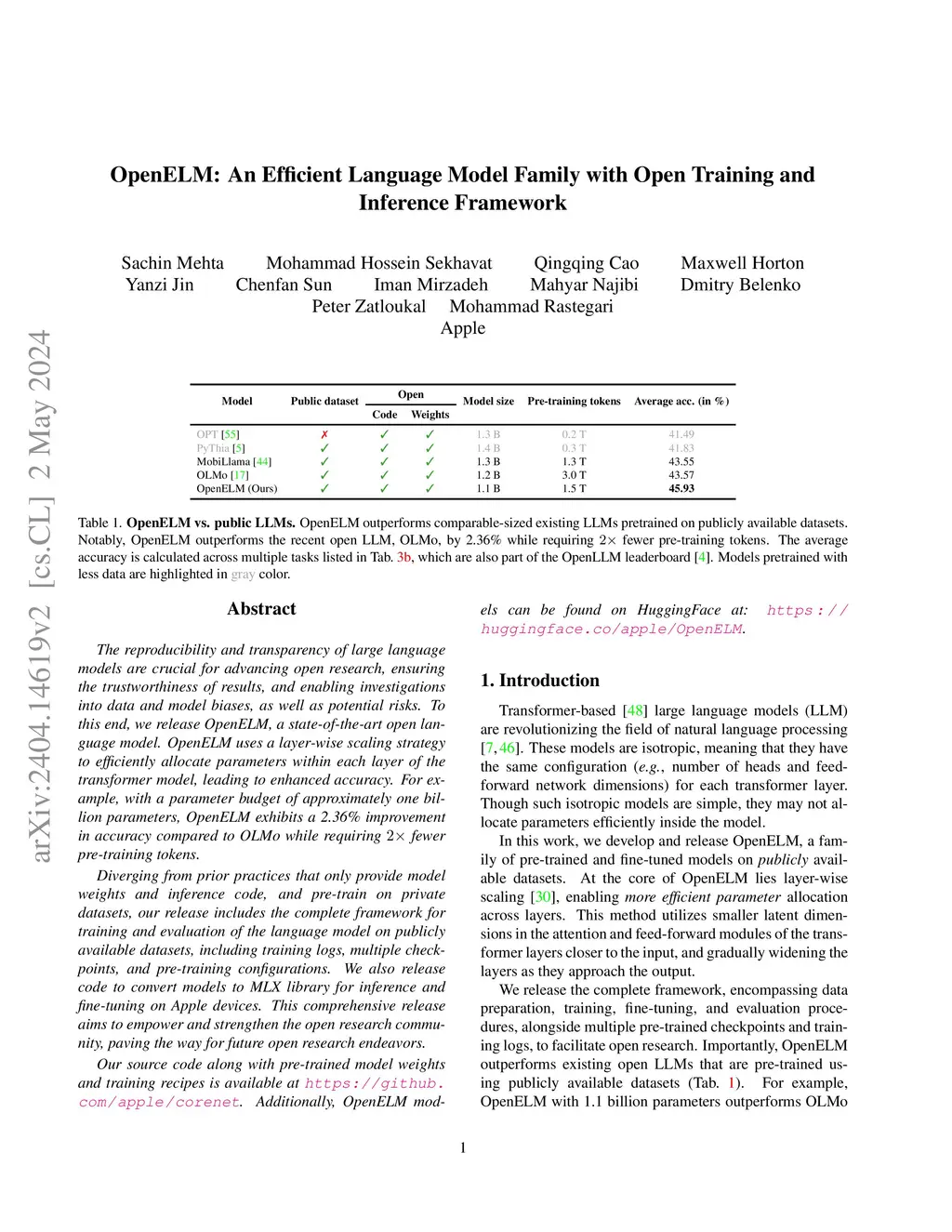 The reproducibility and transparency of large language models are crucial for advancing open research, ensuring the trustworthiness of results, and enabling investigations into data and model biases, as well as potential risks. To this end, we release OpenELM, a state-of-the-art open language model. OpenELM uses a layer-wise scaling strategy to efficiently allocate parameters within each layer of the transformer model, leading to enhanced accuracy. For example, with a parameter budget of approximately one billion parameters, OpenELM exhibits a 2.36% improvement in accuracy compared to OLMo while requiring fewer pre-training tokens. Diverging from prior practices that only provide model weights and inference code, and pre-train on private datasets, our release includes the complete framework for training and evaluation of the language model on publicly available datasets, including training logs, multiple checkpoints, and pre-training configurations. We also release code to convert models to MLX library for inference and fine-tuning on Apple devices. This comprehensive release aims to empower and strengthen the open research community, paving the way for future open research endeavors. Our source code along with pre-trained model weights and training recipes is available at \url{https://github.com/apple/corenet}. Additionally, \model models can be found on HuggingFace at: \url{https://huggingface.co/apple/OpenELM}.