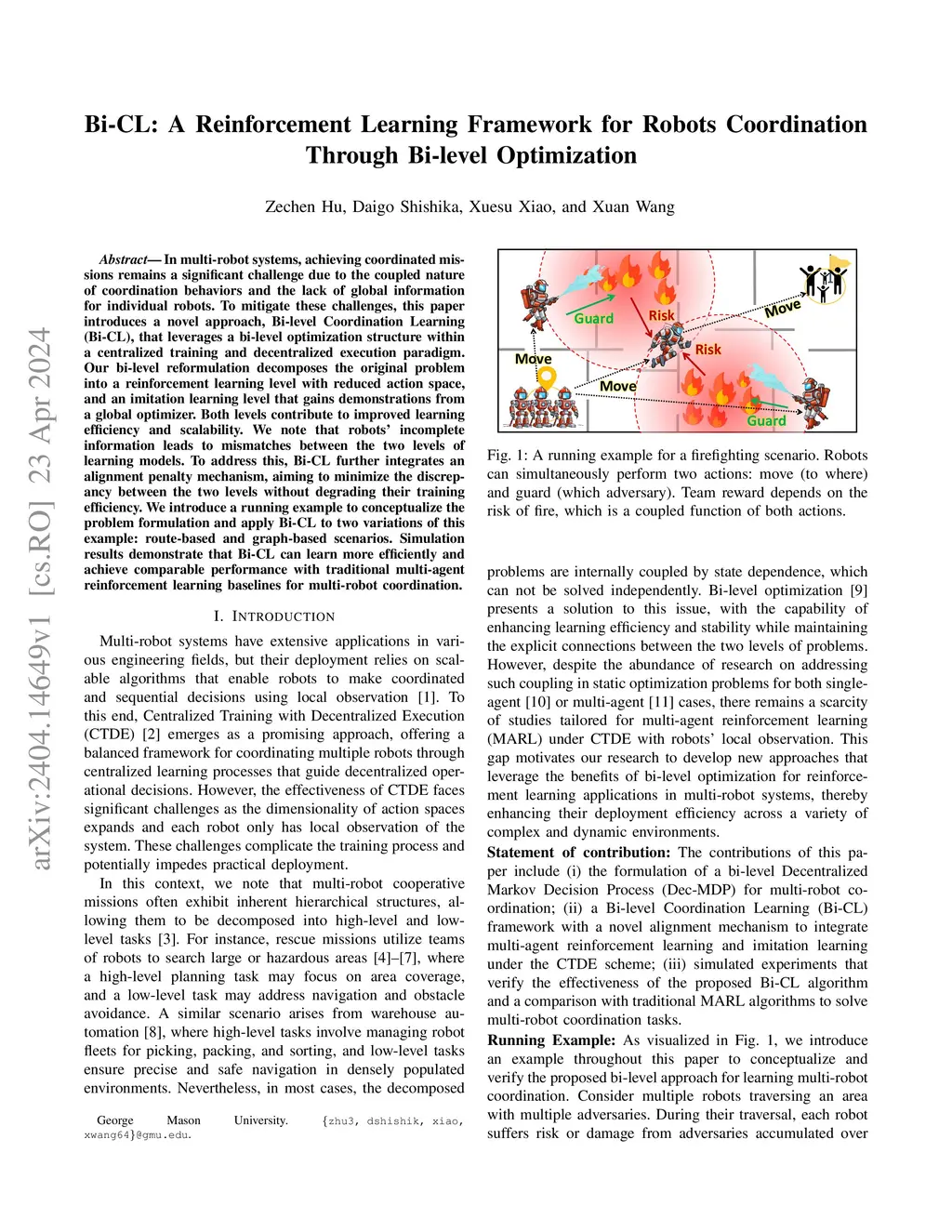 Bi-CL: A Reinforcement Learning Framework for Robots Coordination