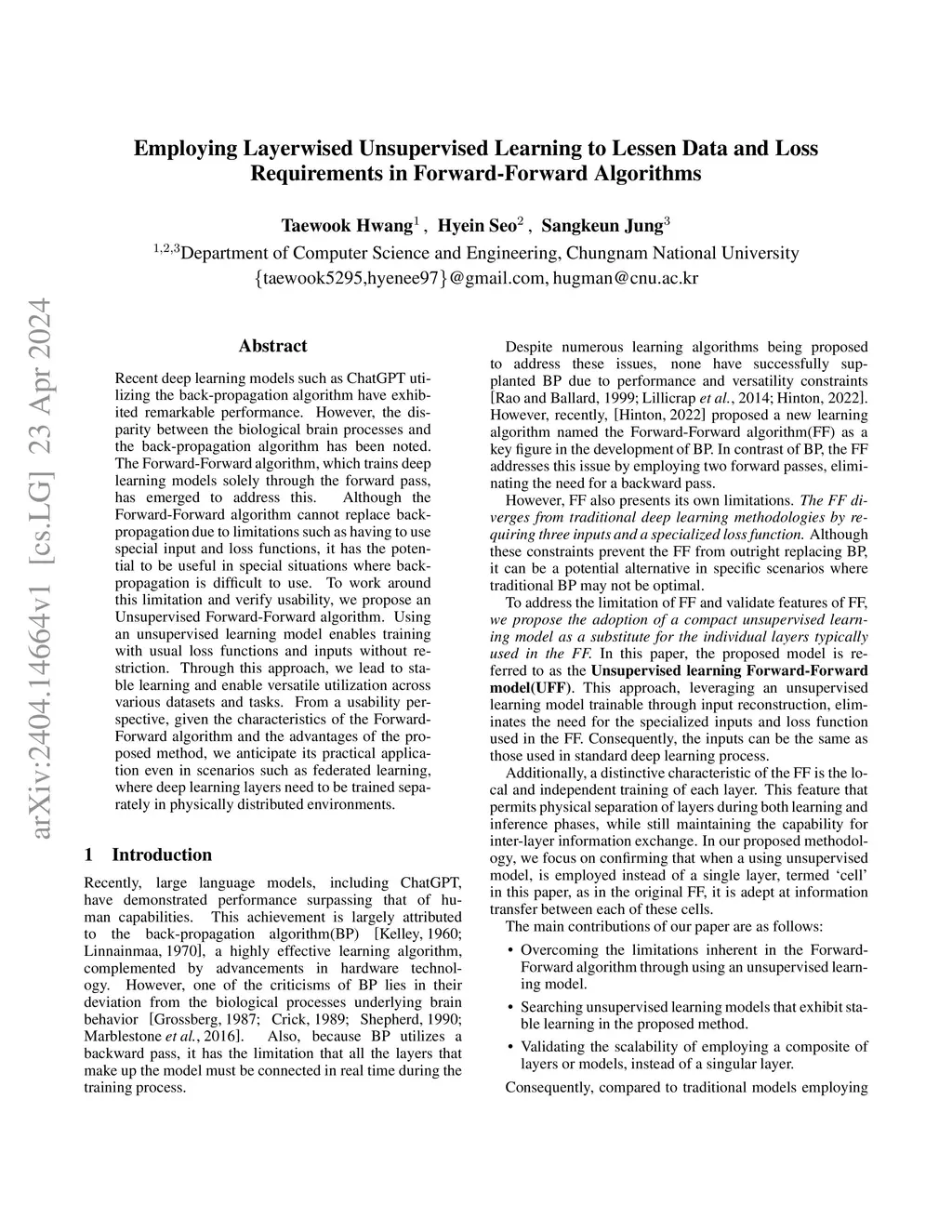 Recent deep learning models such as ChatGPT utilizing the back-propagation algorithm have exhibited remarkable performance. However, the disparity between the biological brain processes and the back-propagation algorithm has been noted. The Forward-Forward algorithm, which trains deep learning models solely through the forward pass, has emerged to address this. Although the Forward-Forward algorithm cannot replace back-propagation due to limitations such as having to use special input and loss functions, it has the potential to be useful in special situations where back-propagation is difficult to use. To work around this limitation and verify usability, we propose an Unsupervised Forward-Forward algorithm. Using an unsupervised learning model enables training with usual loss functions and inputs without restriction. Through this approach, we lead to stable learning and enable versatile utilization across various datasets and tasks. From a usability perspective, given the characteristics of the Forward-Forward algorithm and the advantages of the proposed method, we anticipate its practical application even in scenarios such as federated learning, where deep learning layers need to be trained separately in physically distributed environments.