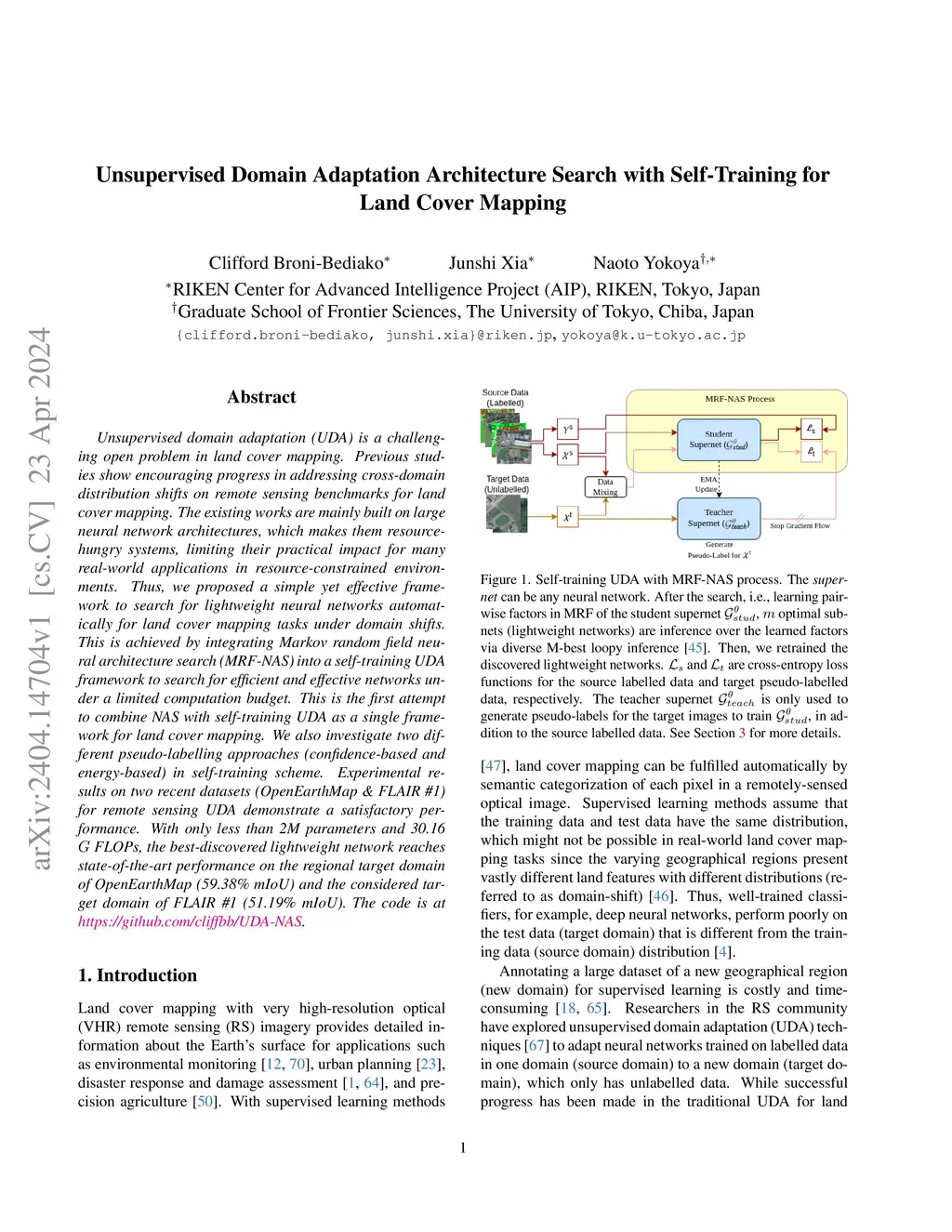 Unsupervised domain adaptation (UDA) is a challenging open problem in land cover mapping. Previous studies show encouraging progress in addressing cross-domain distribution shifts on remote sensing benchmarks for land cover mapping. The existing works are mainly built on large neural network architectures, which makes them resource-hungry systems, limiting their practical impact for many real-world applications in resource-constrained environments. Thus, we proposed a simple yet effective framework to search for lightweight neural networks automatically for land cover mapping tasks under domain shifts. This is achieved by integrating Markov random field neural architecture search (MRF-NAS) into a self-training UDA framework to search for efficient and effective networks under a limited computation budget. This is the first attempt to combine NAS with self-training UDA as a single framework for land cover mapping. We also investigate two different pseudo-labelling approaches (confidence-based and energy-based) in self-training scheme. Experimental results on two recent datasets (OpenEarthMap & FLAIR #1) for remote sensing UDA demonstrate a satisfactory performance. With only less than 2M parameters and 30.16 GFLOPs, the best-discovered lightweight network reaches state-of-the-art performance on the regional target domain of OpenEarthMap (59.38% mIoU) and the considered target domain of FLAIR #1 (51.19% mIoU). The code is at https://github.com/cliffbb/UDA-NAS}{https://github.com/cliffbb/UDA-NAS.