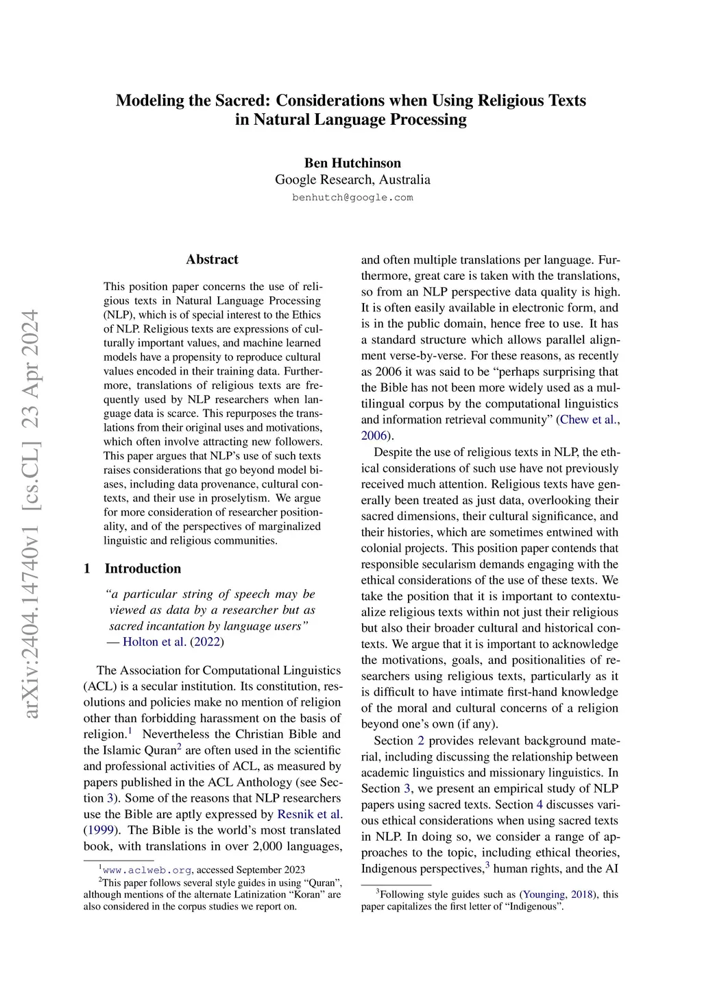 This position paper concerns the use of religious texts in Natural Language Processing (NLP), which is of special interest to the Ethics of NLP. Religious texts are expressions of culturally important values, and machine learned models have a propensity to reproduce cultural values encoded in their training data. Furthermore, translations of religious texts are frequently used by NLP researchers when language data is scarce. This repurposes the translations from their original uses and motivations, which often involve attracting new followers. This paper argues that NLP's use of such texts raises considerations that go beyond model biases, including data provenance, cultural contexts, and their use in proselytism. We argue for more consideration of researcher positionality, and of the perspectives of marginalized linguistic and religious communities.
