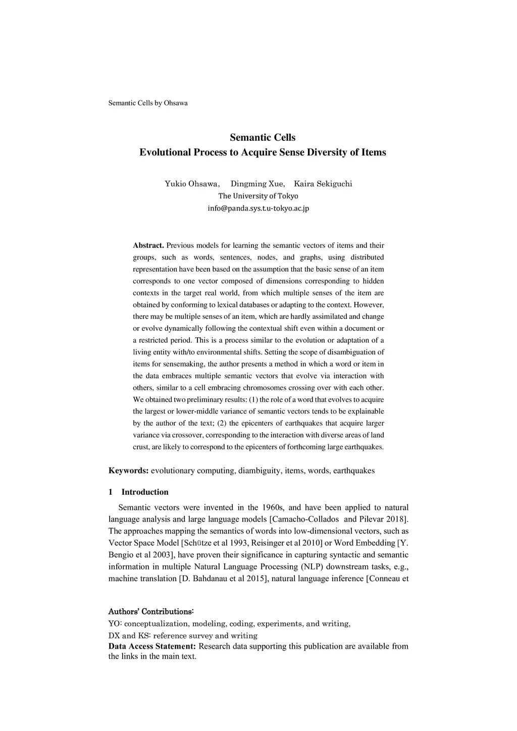 Previous models for learning the semantic vectors of items and their groups, such as words, sentences, nodes, and graphs, using distributed representation have been based on the assumption that the basic sense of an item corresponds to one vector composed of dimensions corresponding to hidden contexts in the target real world, from which multiple senses of the item are obtained by conforming to lexical databases or adapting to the context. However, there may be multiple senses of an item, which are hardly assimilated and change or evolve dynamically following the contextual shift even within a document or a restricted period. This is a process similar to the evolution or adaptation of a living entity with/to environmental shifts. Setting the scope of disambiguation of items for sensemaking, the author presents a method in which a word or item in the data embraces multiple semantic vectors that evolve via interaction with others, similar to a cell embracing chromosomes crossing over with each other. We obtained two preliminary results: (1) the role of a word that evolves to acquire the largest or lower-middle variance of semantic vectors tends to be explainable by the author of the text; (2) the epicenters of earthquakes that acquire larger variance via crossover, corresponding to the interaction with diverse areas of land crust, are likely to correspond to the epicenters of forthcoming large earthquakes.