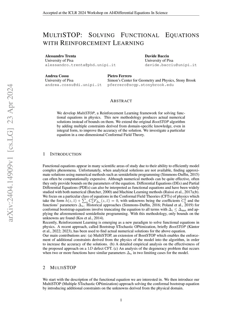 We develop MultiSTOP, a Reinforcement Learning framework for solving functional equations in physics. This new methodology produces actual numerical solutions instead of bounds on them. We extend the original BootSTOP algorithm by adding multiple constraints derived from domain-specific knowledge, even in integral form, to improve the accuracy of the solution. We investigate a particular equation in a one-dimensional Conformal Field Theory.