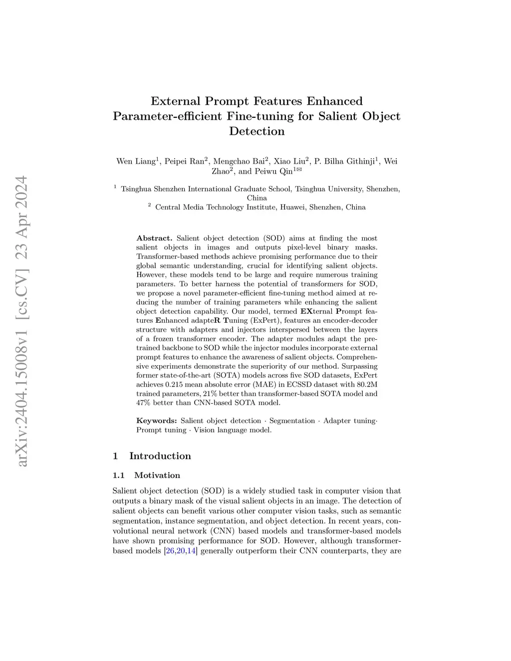 Salient object detection (SOD) aims at finding the most salient objects in images and outputs pixel-level binary masks. Transformer-based methods achieve promising performance due to their global semantic understanding, crucial for identifying salient objects. However, these models tend to be large and require numerous training parameters. To better harness the potential of transformers for SOD, we propose a novel parameter-efficient fine-tuning method aimed at reducing the number of training parameters while enhancing the salient object detection capability. Our model, termed EXternal Prompt features Enhanced adapteR Tuning (ExPert), features an encoder-decoder structure with adapters and injectors interspersed between the layers of a frozen transformer encoder. The adapter modules adapt the pre-trained backbone to SOD while the injector modules incorporate external prompt features to enhance the awareness of salient objects. Comprehensive experiments demonstrate the superiority of our method. Surpassing former state-of-the-art (SOTA) models across five SOD datasets, ExPert achieves 0.215 mean absolute error (MAE) in ECSSD dataset with 80.2M trained parameters, 21% better than transformer-based SOTA model and 47% better than CNN-based SOTA model.