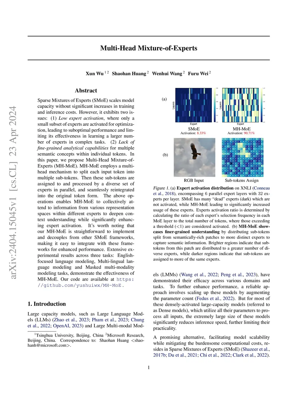 Sparse Mixtures of Experts (SMoE) scales model capacity without significant increases in training and inference costs, but exhibits the following two issues: (1) Low expert activation, where only a small subset of experts are activated for optimization. (2) Lacking fine-grained analytical capabilities for multiple semantic concepts within individual tokens. We propose Multi-Head Mixture-of-Experts (MH-MoE), which employs a multi-head mechanism to split each token into multiple sub-tokens. These sub-tokens are then assigned to and processed by a diverse set of experts in parallel, and seamlessly reintegrated into the original token form. The multi-head mechanism enables the model to collectively attend to information from various representation spaces within different experts, while significantly enhances expert activation, thus deepens context understanding and alleviate overfitting. Moreover, our MH-MoE is straightforward to implement and decouples from other SMoE optimization methods, making it easy to integrate with other SMoE models for enhanced performance. Extensive experimental results across three tasks: English-focused language modeling, Multi-lingual language modeling and Masked multi-modality modeling tasks, demonstrate the effectiveness of MH-MoE.