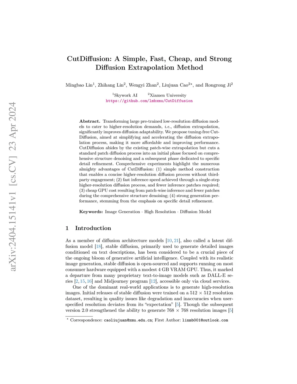 Transforming large pre-trained low-resolution diffusion models to cater to higher-resolution demands, i.e., diffusion extrapolation, significantly improves diffusion adaptability. We propose tuning-free CutDiffusion, aimed at simplifying and accelerating the diffusion extrapolation process, making it more affordable and improving performance. CutDiffusion abides by the existing patch-wise extrapolation but cuts a standard patch diffusion process into an initial phase focused on comprehensive structure denoising and a subsequent phase dedicated to specific detail refinement. Comprehensive experiments highlight the numerous almighty advantages of CutDiffusion: (1) simple method construction that enables a concise higher-resolution diffusion process without third-party engagement; (2) fast inference speed achieved through a single-step higher-resolution diffusion process, and fewer inference patches required; (3) cheap GPU cost resulting from patch-wise inference and fewer patches during the comprehensive structure denoising; (4) strong generation performance, stemming from the emphasis on specific detail refinement.