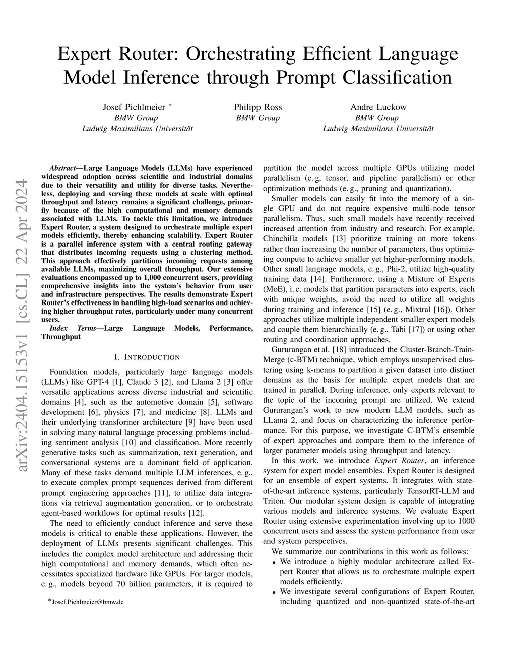 Large Language Models (LLMs) have experienced widespread adoption across scientific and industrial domains due to their versatility and utility for diverse tasks. Nevertheless, deploying and serving these models at scale with optimal throughput and latency remains a significant challenge, primarily because of the high computational and memory demands associated with LLMs. To tackle this limitation, we introduce Expert Router, a system designed to orchestrate multiple expert models efficiently, thereby enhancing scalability. Expert Router is a parallel inference system with a central routing gateway that distributes incoming requests using a clustering method. This approach effectively partitions incoming requests among available LLMs, maximizing overall throughput. Our extensive evaluations encompassed up to 1,000 concurrent users, providing comprehensive insights into the system's behavior from user and infrastructure perspectives. The results demonstrate Expert Router's effectiveness in handling high-load scenarios and achieving higher throughput rates, particularly under many concurrent users.