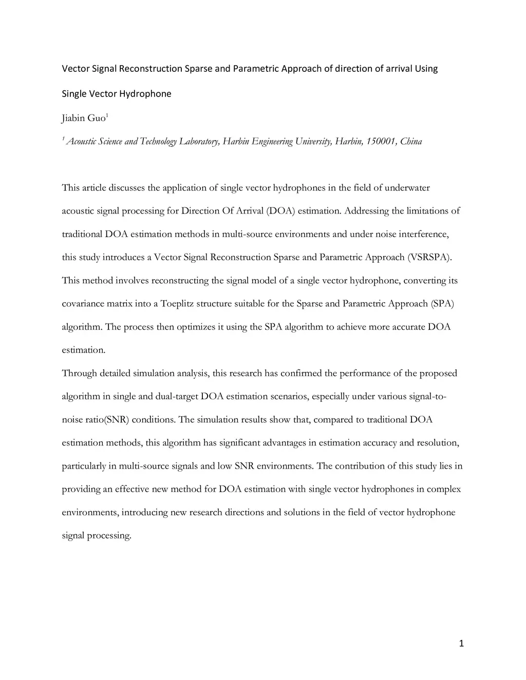 This article discusses the application of single vector hydrophones in the field of underwater acoustic signal processing for Direction Of Arrival (DOA) estimation. Addressing the limitations of traditional DOA estimation methods in multi-source environments and under noise interference, this study introduces a Vector Signal Reconstruction Sparse and Parametric Approach (VSRSPA). This method involves reconstructing the signal model of a single vector hydrophone, converting its covariance matrix into a Toeplitz structure suitable for the Sparse and Parametric Approach (SPA) algorithm. The process then optimizes it using the SPA algorithm to achieve more accurate DOA estimation. Through detailed simulation analysis, this research has confirmed the performance of the proposed algorithm in single and dual-target DOA estimation scenarios, especially under various signal-to-noise ratio(SNR) conditions. The simulation results show that, compared to traditional DOA estimation methods, this algorithm has significant advantages in estimation accuracy and resolution, particularly in multi-source signals and low SNR environments. The contribution of this study lies in providing an effective new method for DOA estimation with single vector hydrophones in complex environments, introducing new research directions and solutions in the field of vector hydrophone signal processing.