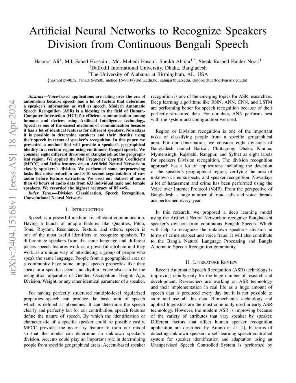 Voice based applications are ruling over the era of automation because speech has a lot of factors that determine a speakers information as well as speech. Modern Automatic Speech Recognition (ASR) is a blessing in the field of Human-Computer Interaction (HCI) for efficient communication among humans and devices using Artificial Intelligence technology. Speech is one of the easiest mediums of communication because it has a lot of identical features for different speakers. Nowadays it is possible to determine speakers and their identity using their speech in terms of speaker recognition. In this paper, we presented a method that will provide a speakers geographical identity in a certain region using continuous Bengali speech. We consider eight different divisions of Bangladesh as the geographical region. We applied the Mel Frequency Cepstral Coefficient (MFCC) and Delta features on an Artificial Neural Network to classify speakers division. We performed some preprocessing tasks like noise reduction and 8-10 second segmentation of raw audio before feature extraction. We used our dataset of more than 45 hours of audio data from 633 individual male and female speakers. We recorded the highest accuracy of 85.44%.