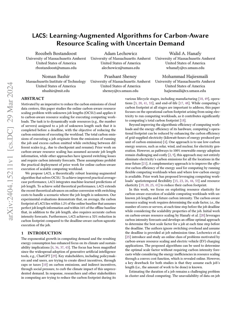Motivated by an imperative to reduce the carbon emissions of cloud data centers, this paper studies the online carbon-aware resource scaling problem with unknown job lengths (OCSU) and applies it to carbon-aware resource scaling for executing computing workloads. The task is to dynamically scale resources (e.g., the number of servers) assigned to a job of unknown length such that it is completed before a deadline, with the objective of reducing the carbon emissions of executing the workload. The total carbon emissions of executing a job originate from the emissions of running the job and excess carbon emitted while switching between different scales (e.g., due to checkpoint and resume). Prior work on carbon-aware resource scaling has assumed accurate job length information, while other approaches have ignored switching losses and require carbon intensity forecasts. These assumptions prohibit the practical deployment of prior work for online carbon-aware execution of scalable computing workload. We propose LACS, a theoretically robust learning-augmented algorithm that solves OCSU. To achieve improved practical average-case performance, LACS integrates machine-learned predictions of job length. To achieve solid theoretical performance, LACS extends the recent theoretical advances on online conversion with switching costs to handle a scenario where the job length is unknown. Our experimental evaluations demonstrate that, on average, the carbon footprint of LACS lies within 1.2% of the online baseline that assumes perfect job length information and within 16% of the offline baseline that, in addition to the job length, also requires accurate carbon intensity forecasts. Furthermore, LACS achieves a 32% reduction in carbon footprint compared to the deadline-aware carbon-agnostic execution of the job.