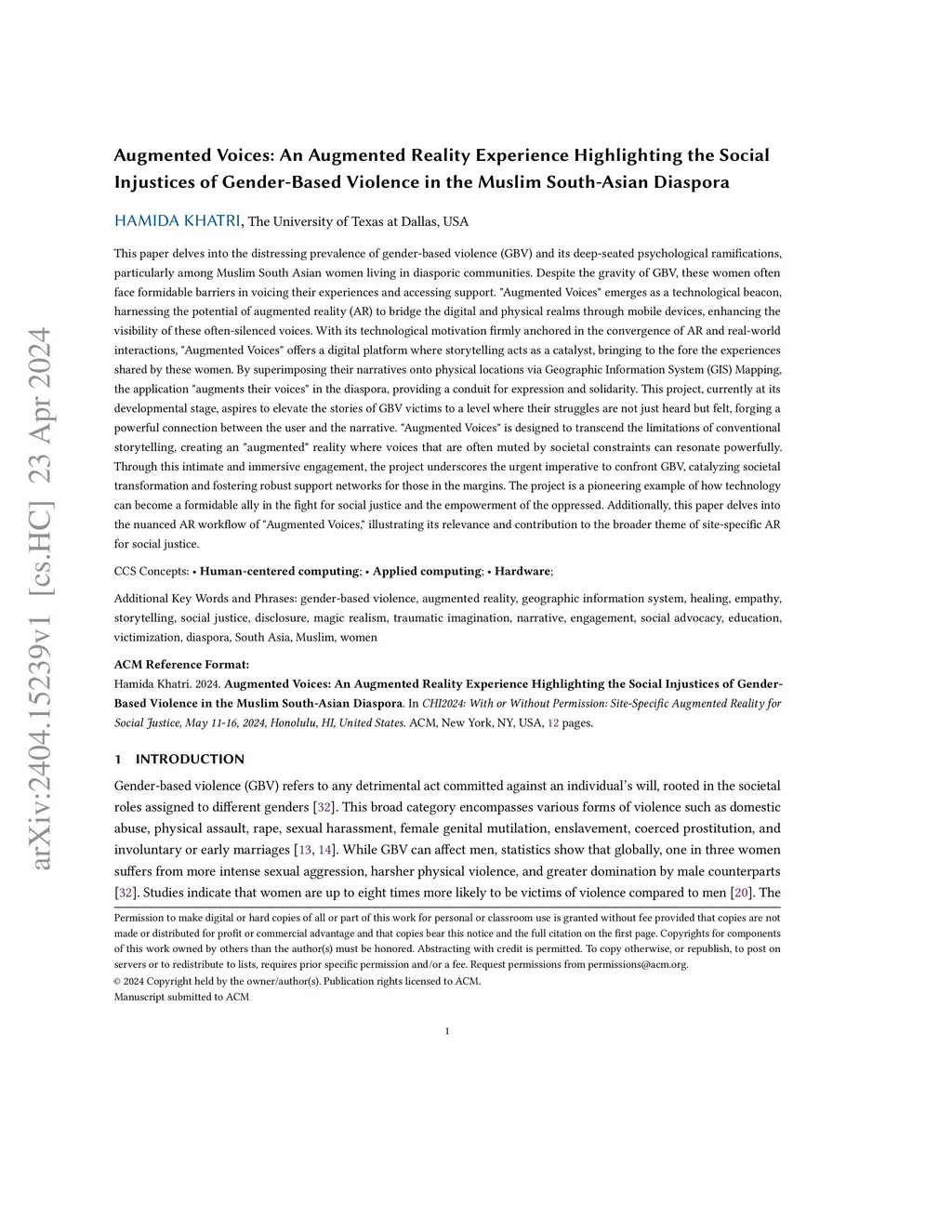 This paper delves into the distressing prevalence of gender-based violence (GBV) and its deep-seated psychological ramifications, particularly among Muslim South Asian women living in diasporic communities. Despite the gravity of GBV, these women often face formidable barriers in voicing their experiences and accessing support. "Augmented Voices" emerges as a technological beacon, harnessing the potential of augmented reality (AR) to bridge the digital and physical realms through mobile devices, enhancing the visibility of these often-silenced voices. With its technological motivation firmly anchored in the convergence of AR and real-world interactions, "Augmented Voices" offers a digital platform where storytelling acts as a catalyst, bringing to the fore the experiences shared by these women. By superimposing their narratives onto physical locations via Geographic Information System (GIS) Mapping, the application "augments their voices" in the diaspora, providing a conduit for expression and solidarity. This project, currently at its developmental stage, aspires to elevate the stories of GBV victims to a level where their struggles are not just heard but felt, forging a powerful connection between the user and the narrative. It is designed to transcend the limitations of conventional storytelling, creating an "augmented" reality where voices that are often muted by societal constraints can resonate powerfully. The project underscores the urgent imperative to confront GBV, catalyzing societal transformation and fostering robust support networks for those in the margins. It is a pioneering example of how technology can become a formidable ally in the fight for social justice and the empowerment of the oppressed. Additionally, this paper delves into the AR workflow illustrating its relevance and contribution to the broader theme of site-specific AR for social justice.