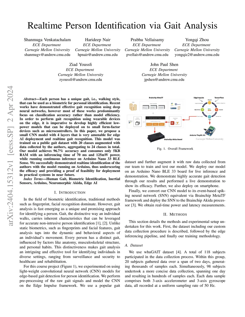 Each person has a unique gait, i.e., walking style, that can be used as a biometric for personal identification. Recent works have demonstrated effective gait recognition using deep neural networks, however most of these works predominantly focus on classification accuracy rather than model efficiency. In order to perform gait recognition using wearable devices on the edge, it is imperative to develop highly efficient low-power models that can be deployed on to small form-factor devices such as microcontrollers. In this paper, we propose a small CNN model with 4 layers that is very amenable for edge AI deployment and realtime gait recognition. This model was trained on a public gait dataset with 20 classes augmented with data collected by the authors, aggregating to 24 classes in total. Our model achieves 96.7% accuracy and consumes only 5KB RAM with an inferencing time of 70 ms and 125mW power, while running continuous inference on Arduino Nano 33 BLE Sense. We successfully demonstrated realtime identification of the authors with the model running on Arduino, thus underscoring the efficacy and providing a proof of feasiblity for deployment in practical systems in near future.
