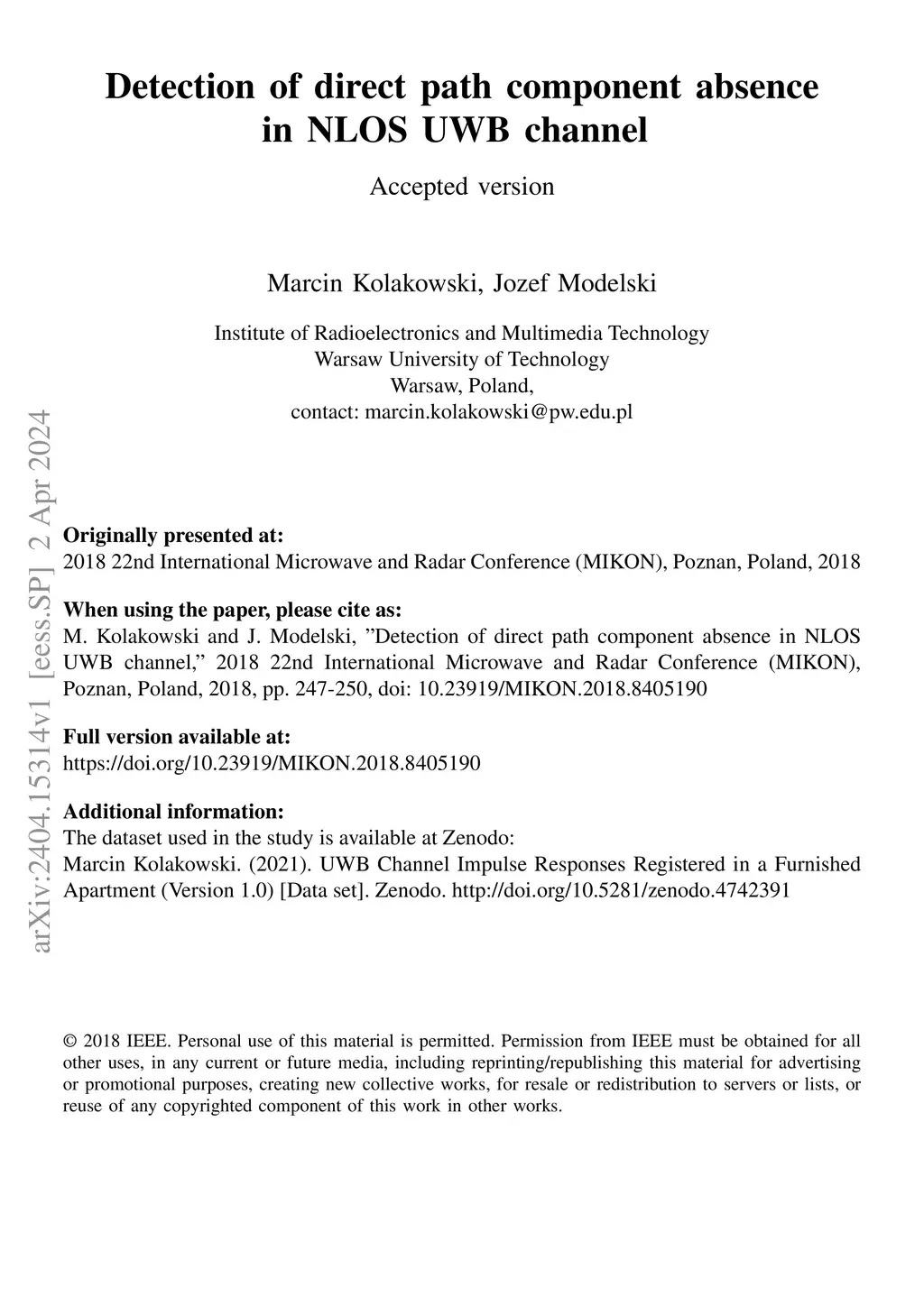In this paper a novel NLOS (Non-Line-of-Sight) identification technique is proposed. In comparison to other methods described in the literature, it discerns a situation when the delayed direct path component is available from when it's totally blocked and introduced biases are much higher and harder to mitigate. In the method, NLOS identification is performed using Support Vector Machine (SVM) algorithm based on various signal features. The paper includes description of the method and the results of performed experiment.