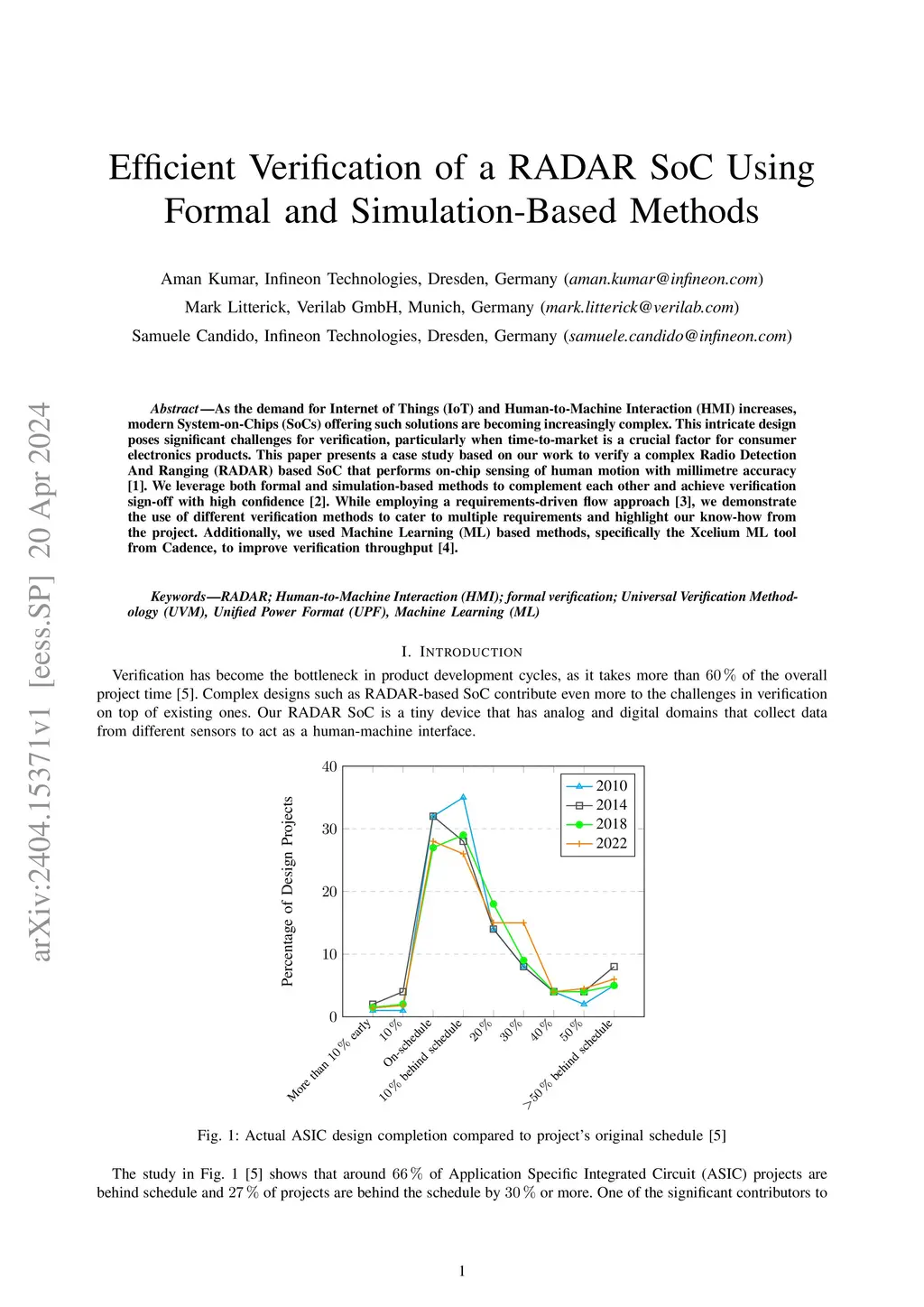 As the demand for Internet of Things (IoT) and Human-to-Machine Interaction (HMI) increases, modern System-on-Chips (SoCs) offering such solutions are becoming increasingly complex. This intricate design poses significant challenges for verification, particularly when time-to-market is a crucial factor for consumer electronics products. This paper presents a case study based on our work to verify a complex Radio Detection And Ranging (RADAR) based SoC that performs on-chip sensing of human motion with millimetre accuracy. We leverage both formal and simulation-based methods to complement each other and achieve verification sign-off with high confidence. While employing a requirements-driven flow approach, we demonstrate the use of different verification methods to cater to multiple requirements and highlight our know-how from the project. Additionally, we used Machine Learning (ML) based methods, specifically the Xcelium ML tool from Cadence, to improve verification throughput.